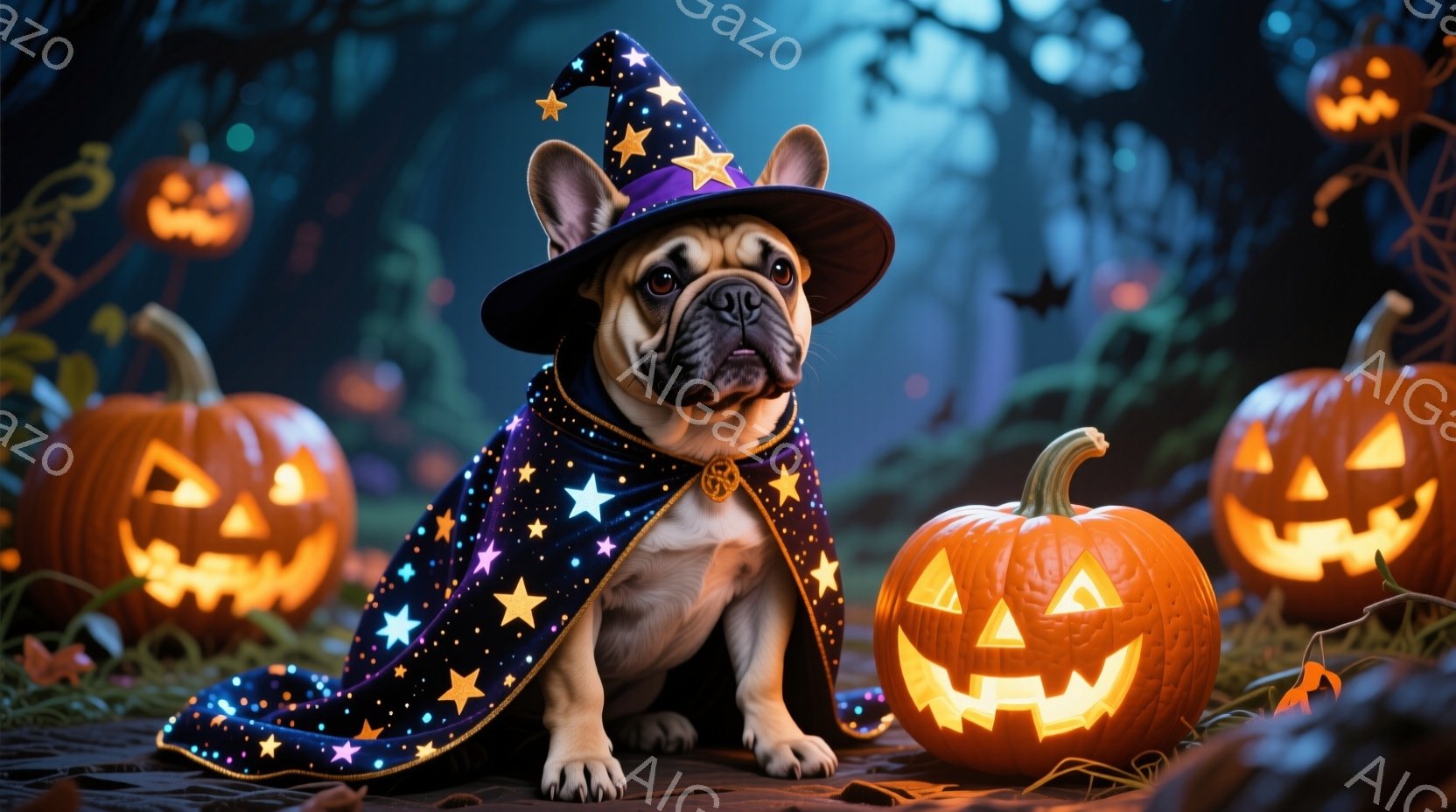 棕色のフレンチブルドッグが、星が散りばめられた紫色のマントと、先のとがった黒い帽子を身に着けて座っています。その表情は少し真剣で、ハロウィーンの飾りであるジャック・オ・ランタンに囲まれた木製の板の上に座っています。背景は暗い森で、ぼんやりと光るジャック・オ・ランタンがハロウィーンの不気味な雰囲気を醸し出しています。