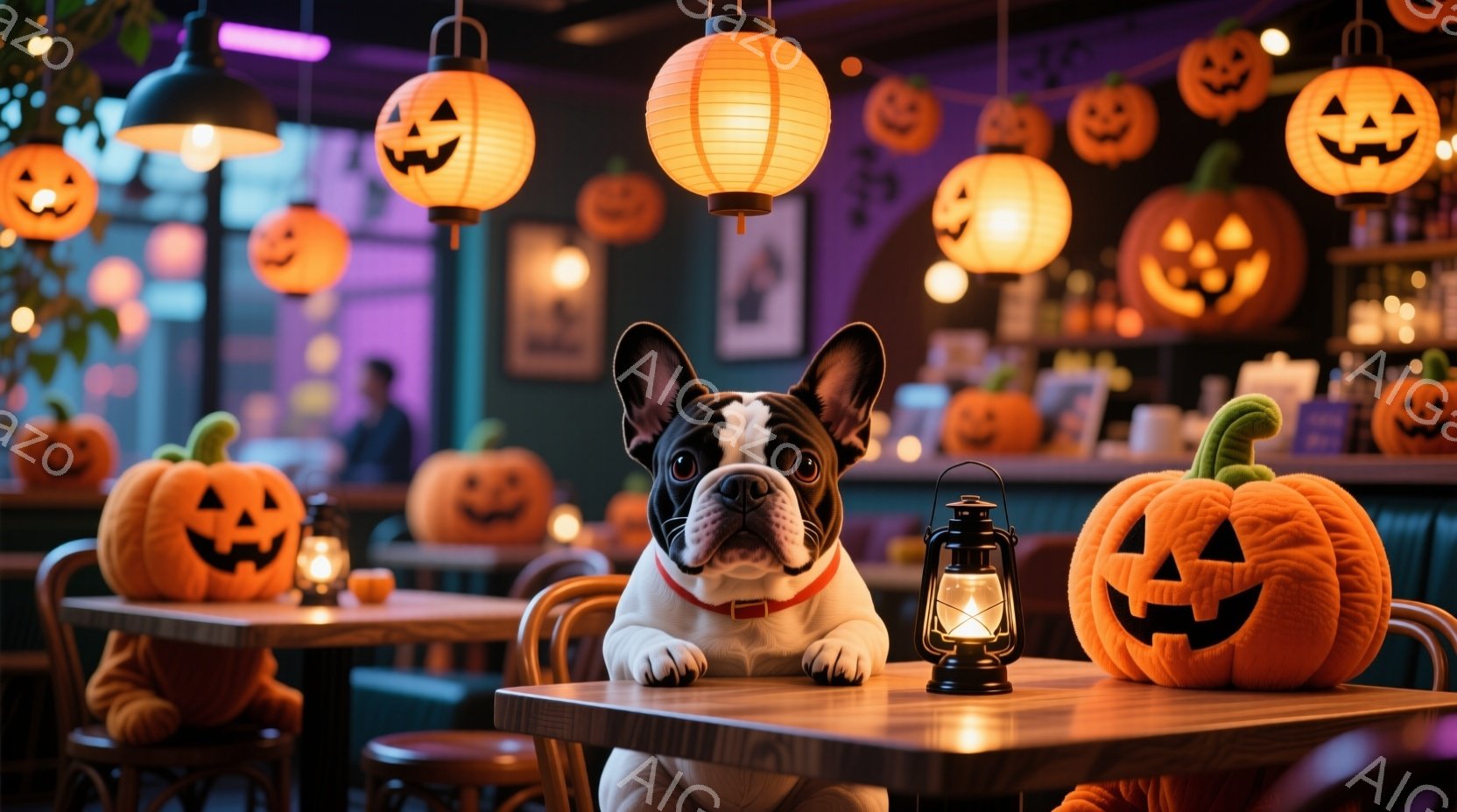 白と黒のフレンチブルドッグが、ハロウィンの装飾が施されたバーのテーブルに座っています。 黒い蝶ネクタイをつけ、テーブルの前に白い小さなカードが置かれています。背景には、オレンジ色のジャック・オー・ランタンのランタンやぬいぐるみ、そしてハロウィンの飾り付けがされ、暖かくお祝いの雰囲気です。