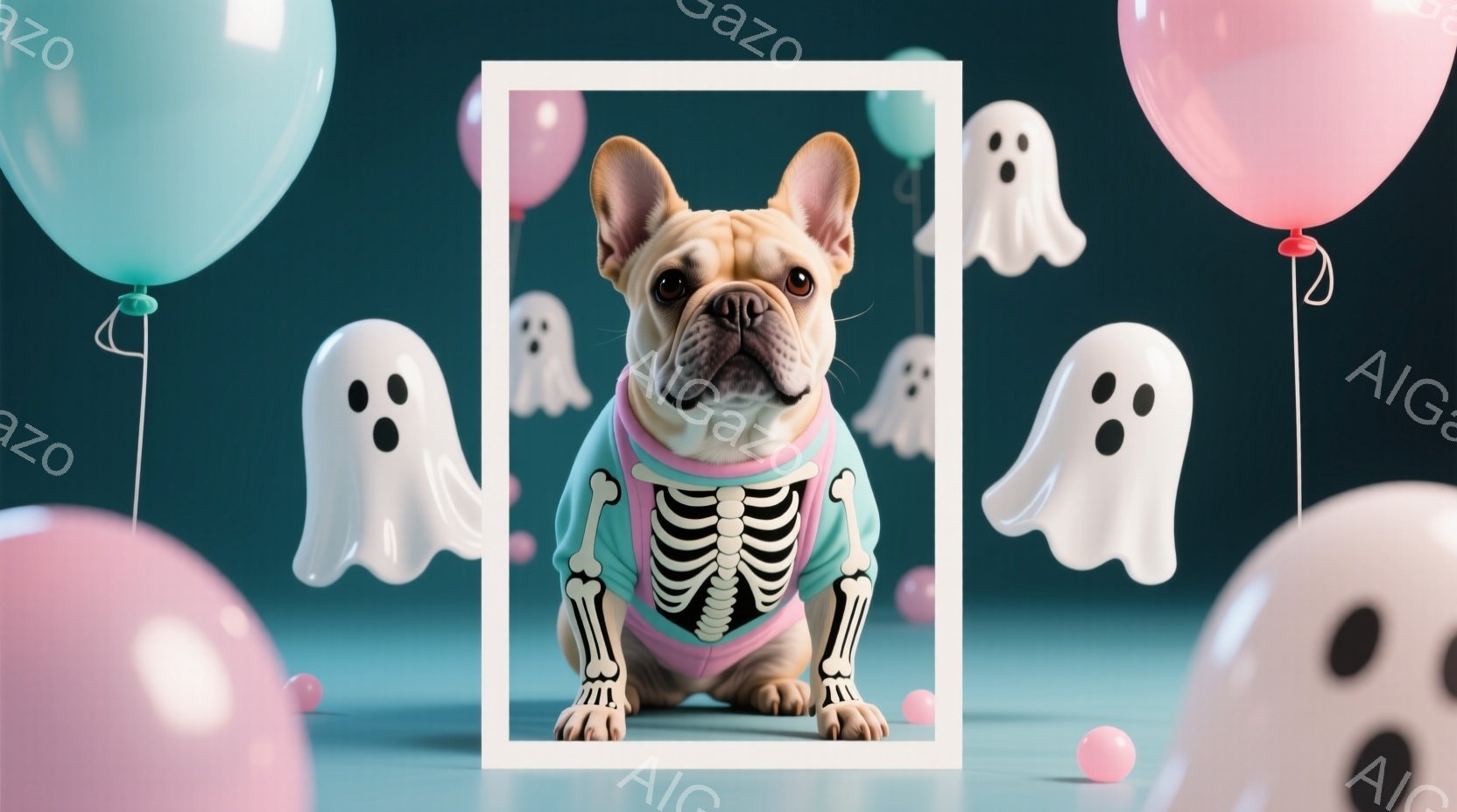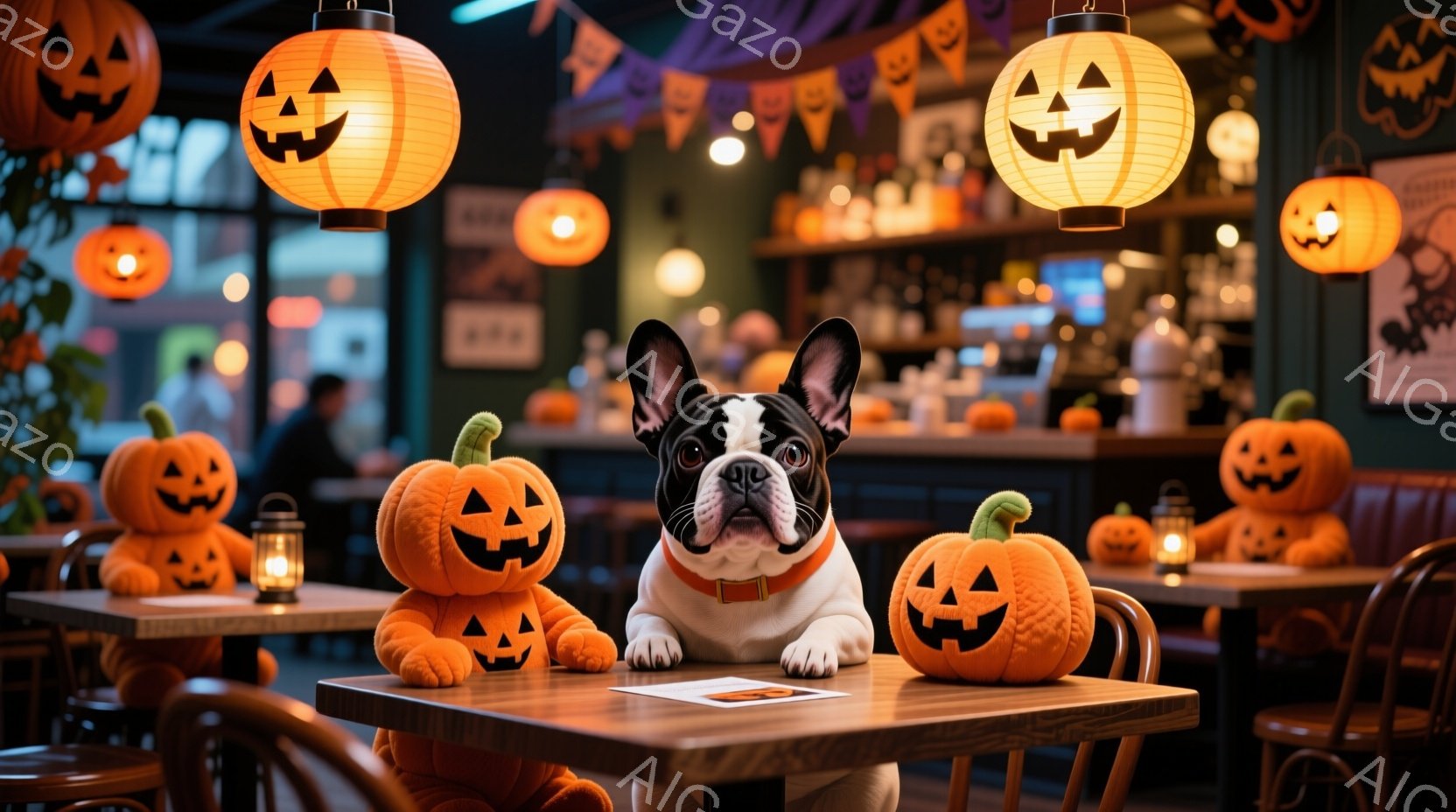 ハロウィーンの装飾が施されたレストランで、パンプキン柄の衣装を着たフレンチブルドッグがテーブルに座っている。テーブルの上には、パンプキン型のおもちゃと小さなランタンが置かれ、犬は前足を組み、リラックスした表情でこちらを見ている。背景には、他にもパンプキン型の装飾が吊り下げられ、暖かい光に包まれた、楽しいハロウィーンの雰囲気が漂っている。