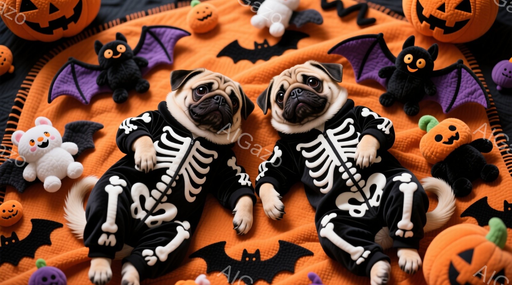 ハロウィーンをテーマにした背景に、骸骨のコスチュームを着た2匹のパグが写っています。2匹とも四つん這いで、リラックスした表情でカメラを見ており、背景にはオレンジ色のカボチャや黒いコウモリのぬいぐるみが散りばめられています。全体的に、お祝いムードで可愛らしい雰囲気です。