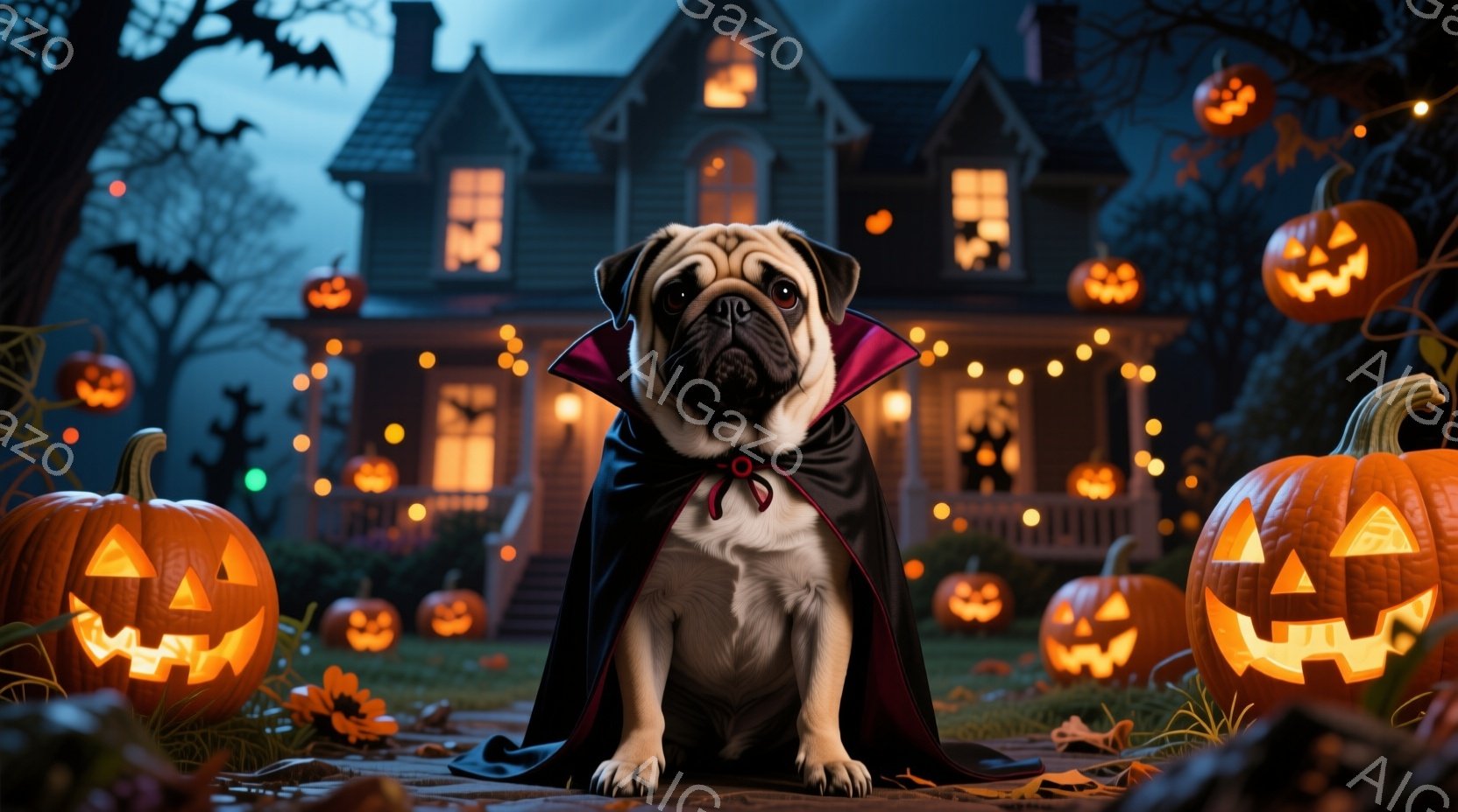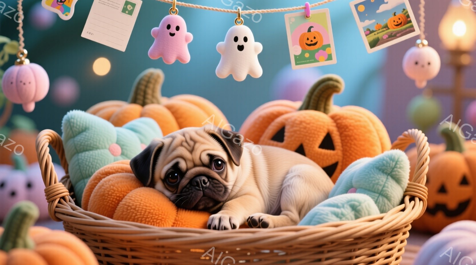 犬がハロウィン風味のチョコレートを入ったバスケットの中に入り、枕として使用する場面である。その目は閉じており、犬は落ち着いて寝ている。バスケットは多くの色鮮やかなハロウィンのパフェで埋められており、それが背景にある。様々な幽霊のデコレーションも描かれています。漫画のようなスタイルで描かれ、楽しくカラフルな調和を持っている。