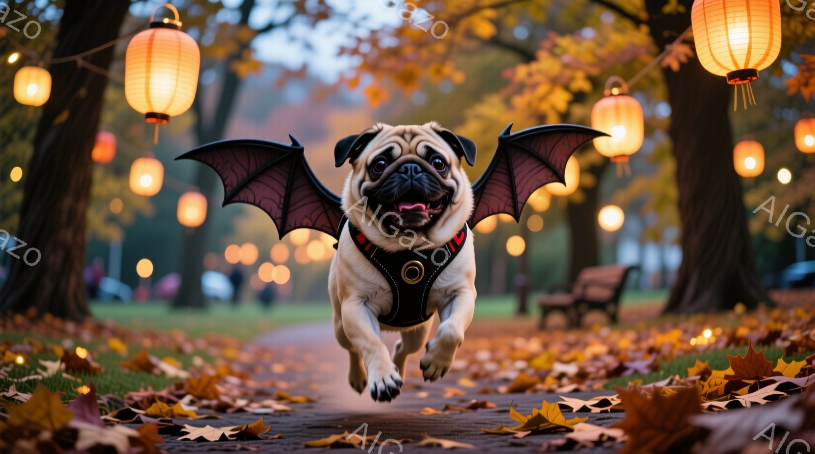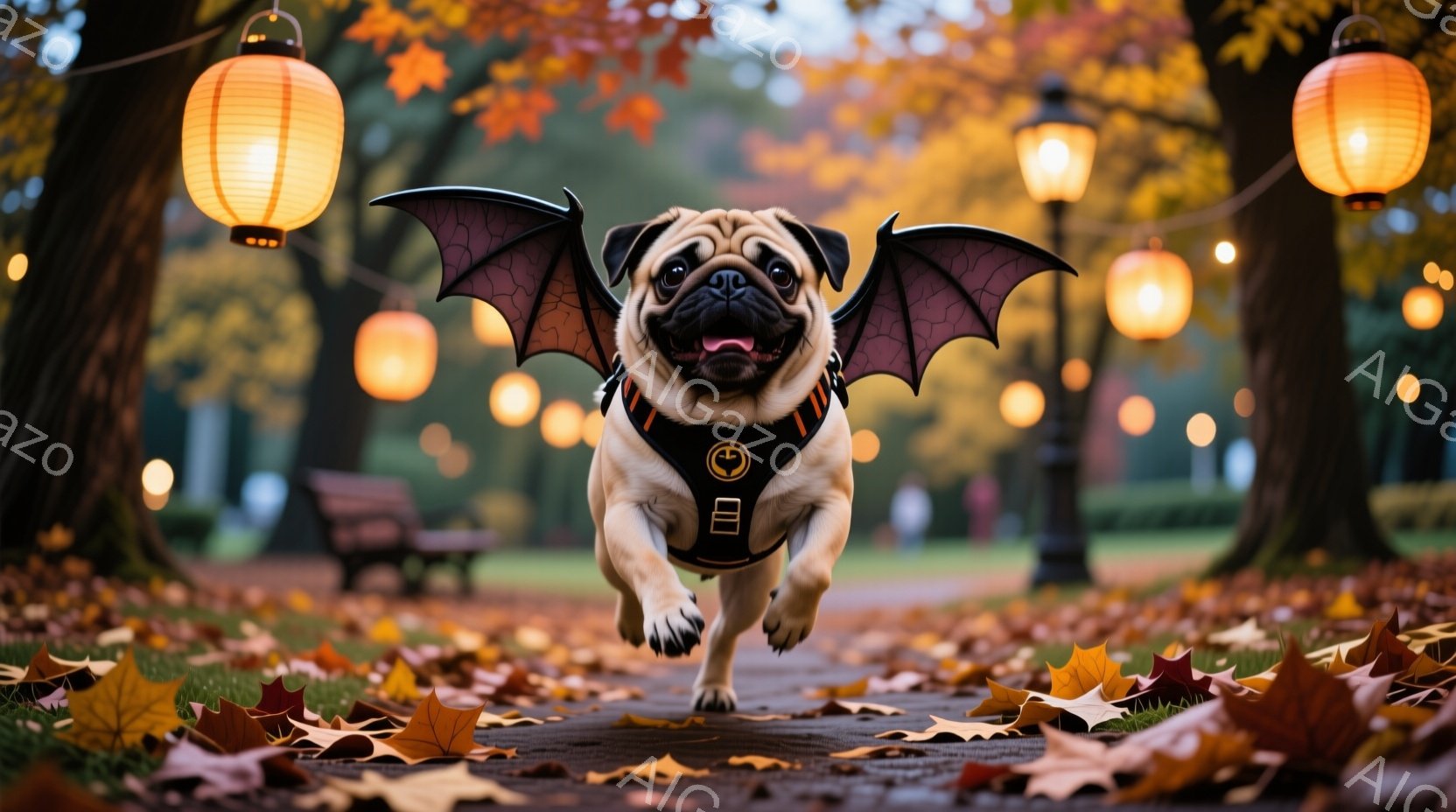かわいいパグ犬が、まるで空を飛んでいるかのように地面を駆け抜けています。ハロウィーンを思わせるコウモリの羽とベストを身につけ、嬉しそうな表情で楽しんでいます。背景には鮮やかな紅葉と、ぼんやりと光る提灯が並び、幻想的な秋の雰囲気が漂っています。
