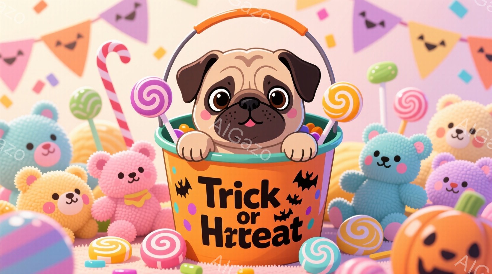 オレンジ色の背景に、パステルカラーのキャンディやクマのぬいぐるみ、カボチャのランタンが散りばめられています。バケツの中に、大きな瞳でこちらを見つめる子犬が可愛らしく座っており、全体的にハロウィンの楽しい雰囲気を醸し出しています。文字として「Trick or Treat」がバケツに描かれており、お菓子をもらうことを期待しているような、遊び心溢れるイメージです。