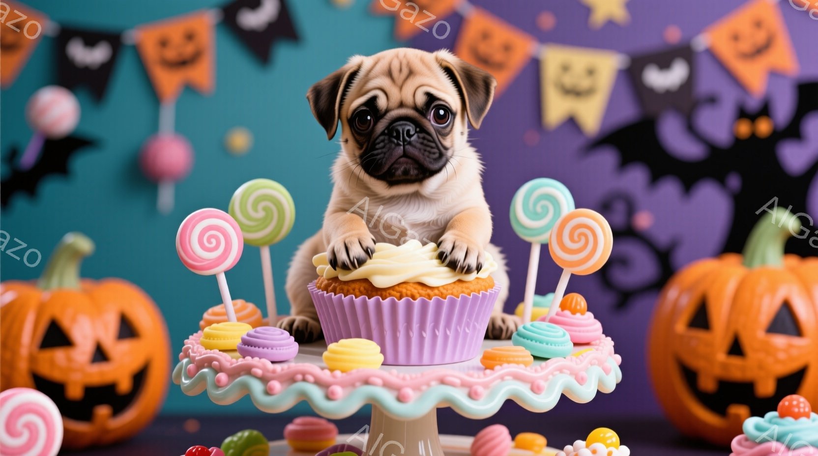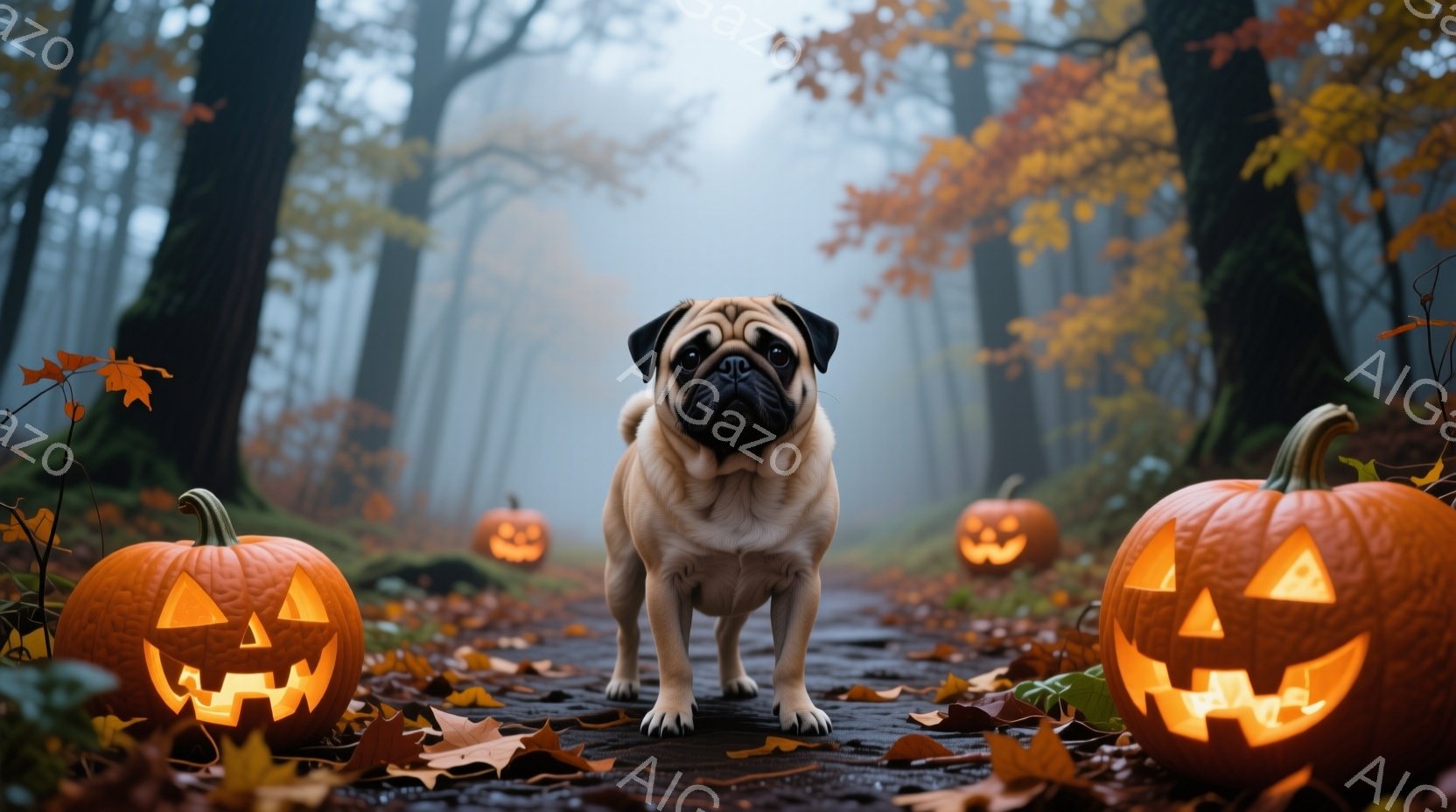 パグが落ち葉が散らばる森の道の中央に立っている。周囲にはジャック・オー・ランタンが並び、ハロウィーンの雰囲気を醸し出している。背景は霧に包まれた木々で、全体的に少し不気味でありながらも温かみのある雰囲気である。