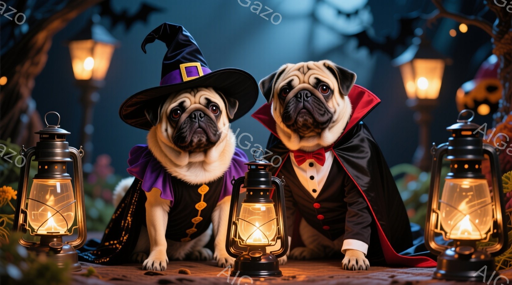 パグ2匹がハロウィーンの衣装を着ています。左のパグは紫色のローブと先の尖った帽子をかぶり、右のパグは黒いスーツ、赤い蝶ネクタイ、そしてマントを身につけています。周囲にはランタンが灯り、背景には木のシルエットやコウモリが描かれ、ハロウィーンの夜の雰囲気が漂っています。