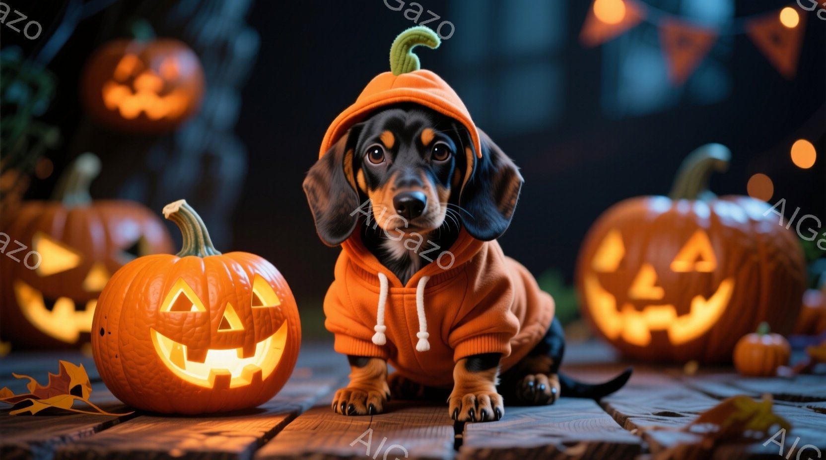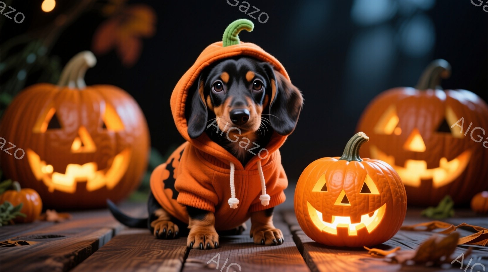 短毛のダックスフントがハロウィーンの衣装を着て、彫刻されたカボチャに囲まれています。犬はオレンジ色のパーカーを着ており、頭にはカボチャの帽子がついています。背景には暖色系の照明と木製のテーブルがあり、全体的にハロウィーンらしい温かく楽しい雰囲気が漂っています。