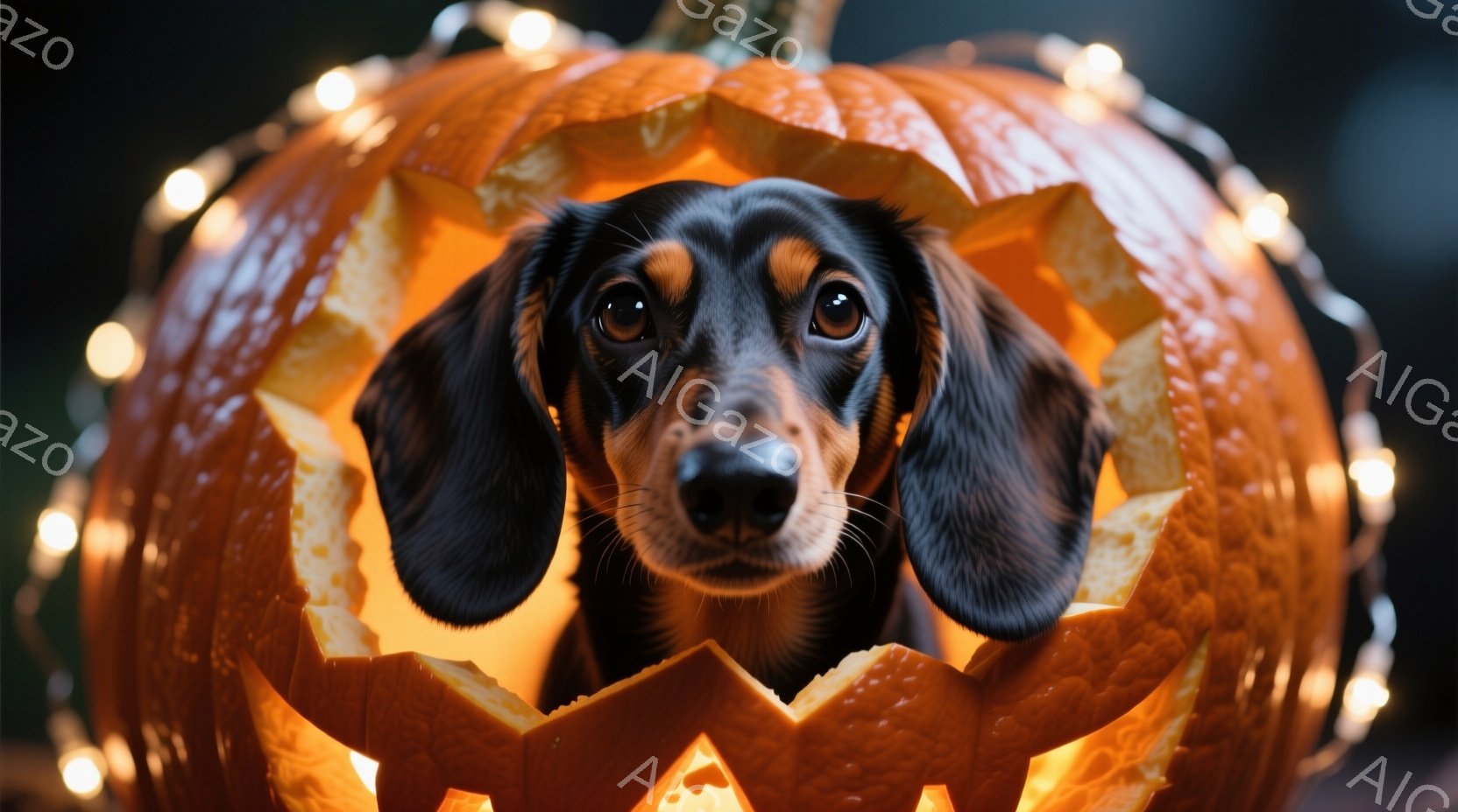 黒い毛並みに茶色のアクセントが入ったダックスフンドが、ハロウィン風のくり抜かれたカボチャの中に顔を出しています。犬はカメラに向かってまっすぐ見つめ、わずかに口角が上がっているようで、穏やかで愛らしい表情をしています。背景は暗く、カボチャの周囲にはキラキラと輝く電飾が飾られており、お祝いムードを演出しています。