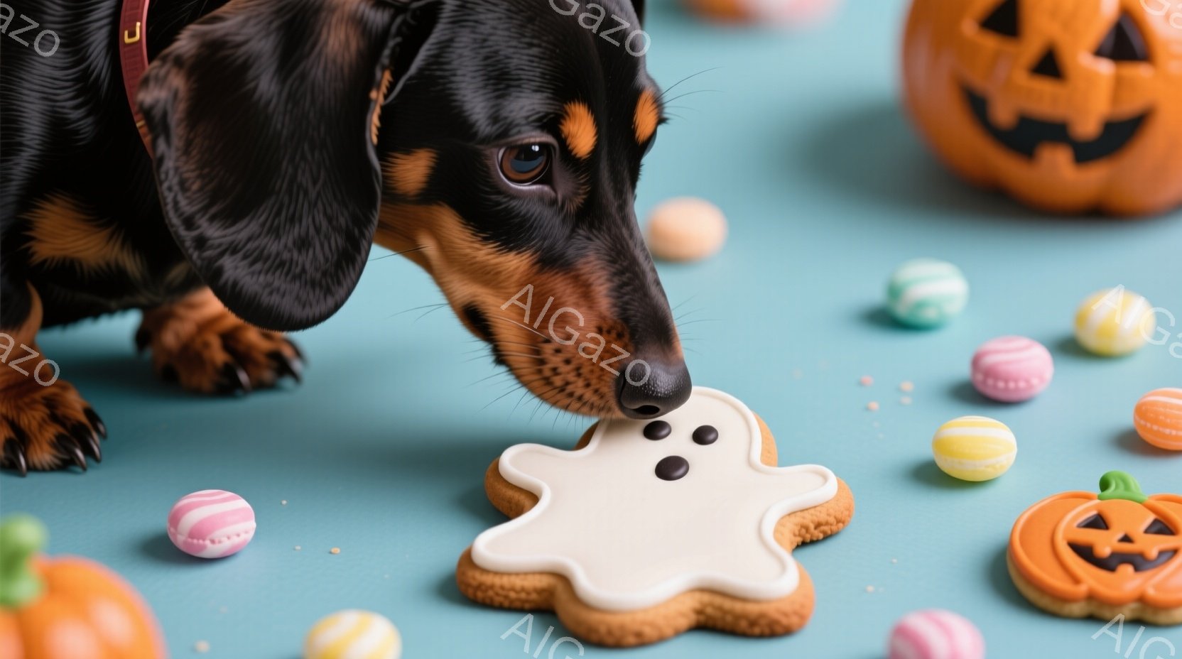 長い胴を持つダックスフンドが、魔女の帽子をかぶり、ハロウィーンの飾り付けがされた家の階段に立っています。周りにはジャック・オー・ランタンが置かれ、落ち葉が舞い散る秋の夜の雰囲気を醸し出しています。暖色の照明とカボチャの光が、ハロウィーンの楽しい雰囲気を強調しています。