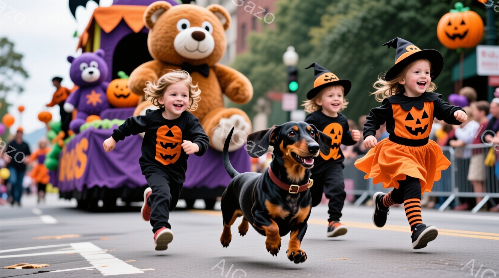 ハロウィーンのパレードで、オレンジ色のカボチャの衣装を着た女の子2人と、黒い衣装を着た男の子が楽しそうに走り出しています。彼らの前には、長い胴の茶色のダックスフンドが同じように走っており、背景には大きなカボチャやテディベアのフロートが見えます。晴れた日の街並みが広がり、ハロウィーンの活気ある雰囲気が感じられます。