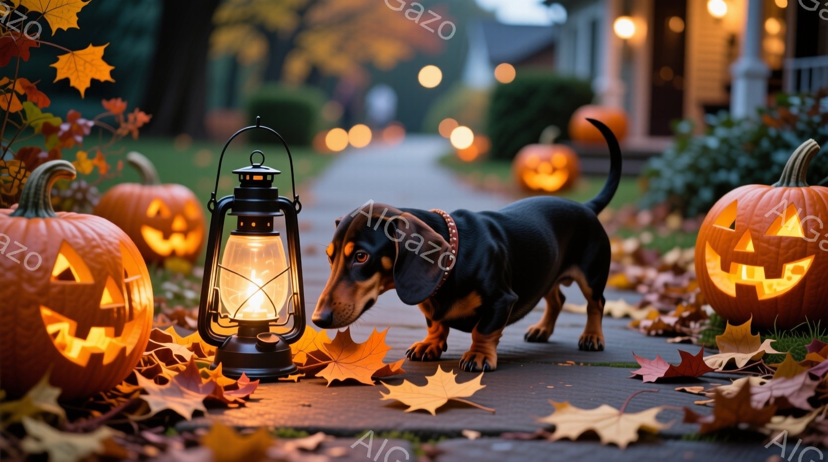 ハロウィーンの飾り付けがされた道に、ダックスフンドが佇んでいます。オレンジ色のカボチャのランタンが並び、足元には紅葉が散らばり、古風なランタンが温かい光を放っています。背景にはぼんやりと家々が見え、秋の夜の穏やかで幻想的な雰囲気が漂っています。