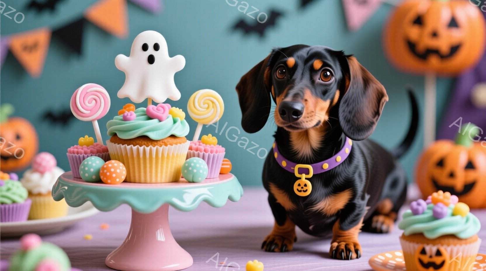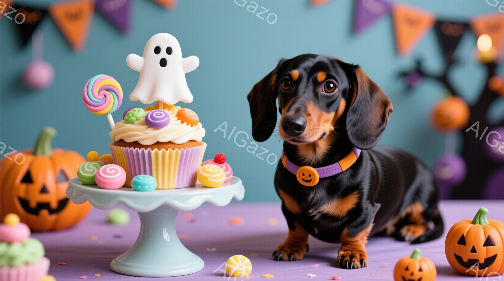 ダックスフントが紫色のテーブルの上に立っており、クリームが塗られたカップケーキの盛り合わせの隣にいます。背景にはハロウィーンの飾り付け、例えばカボチャのランタンやオレンジと紫の旗が描かれており、お菓子も散りばめられています。全体的に、愛らしくてお祝いムードのハロウィーンのシーンです。