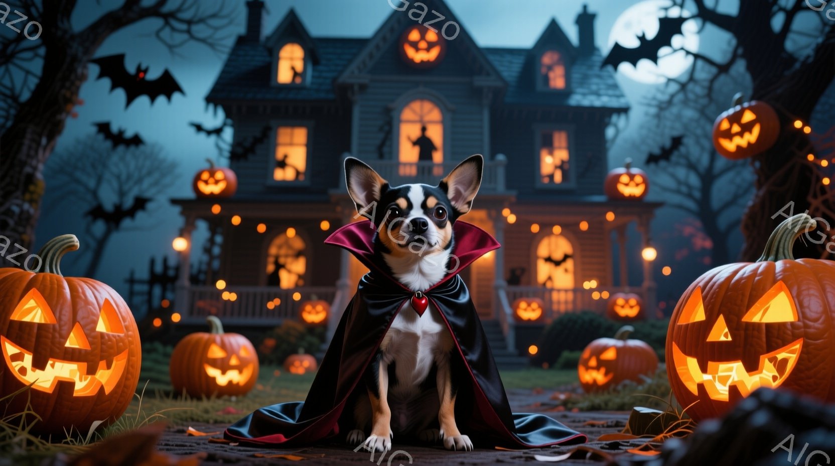 小さなチワワが黒いマントを羽織り、首輪には小さなハートのペンダントが付いています。背景には、ハロウィーンの装飾が施された不気味な屋敷と、ジャック・オ・ランタンが並び、暗い空にはコウモリが飛び交っています。全体的に、ハロウィーンの夜を舞台にした、少し不気味で楽しい雰囲気の画像です。