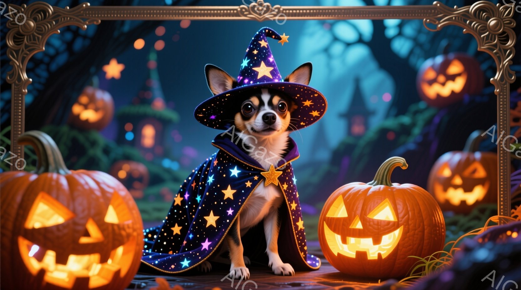 この無料AI生成画像「玄関の段差に、ハロウィーンのくり抜かれたカボチャが並び、その間をキツネのような顔立ちのチワワが歩いています。カボチャは不気味な笑顔を浮かべ、中から温かい光が漏れています。背景には、落ち葉が散らばる階段と薄暗い家が見え、秋の夜の静かで幻想的な雰囲気を醸し出しています。」は、2025年10月24日に作成されました。 サイズは 1664×928px の高解像度で、商用利用も可能なフリー素材として提供しています。
