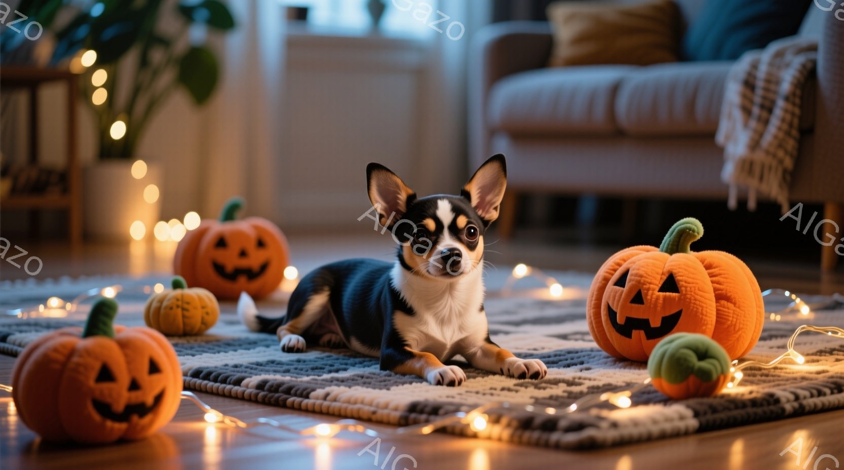 白と黒の毛並みをした小さなチワワが、ハロウィーンの飾りである様々な大きさのジャック・オー・ランタンと、温かい光を放つストリングライトに囲まれて、敷物の上に横たわっています。その犬は前を見つめ、好奇心と穏やかさを表す表情をしています。背景には、ソファと暖色の照明が見え、全体的に暖かく、お祝いの雰囲気です。
