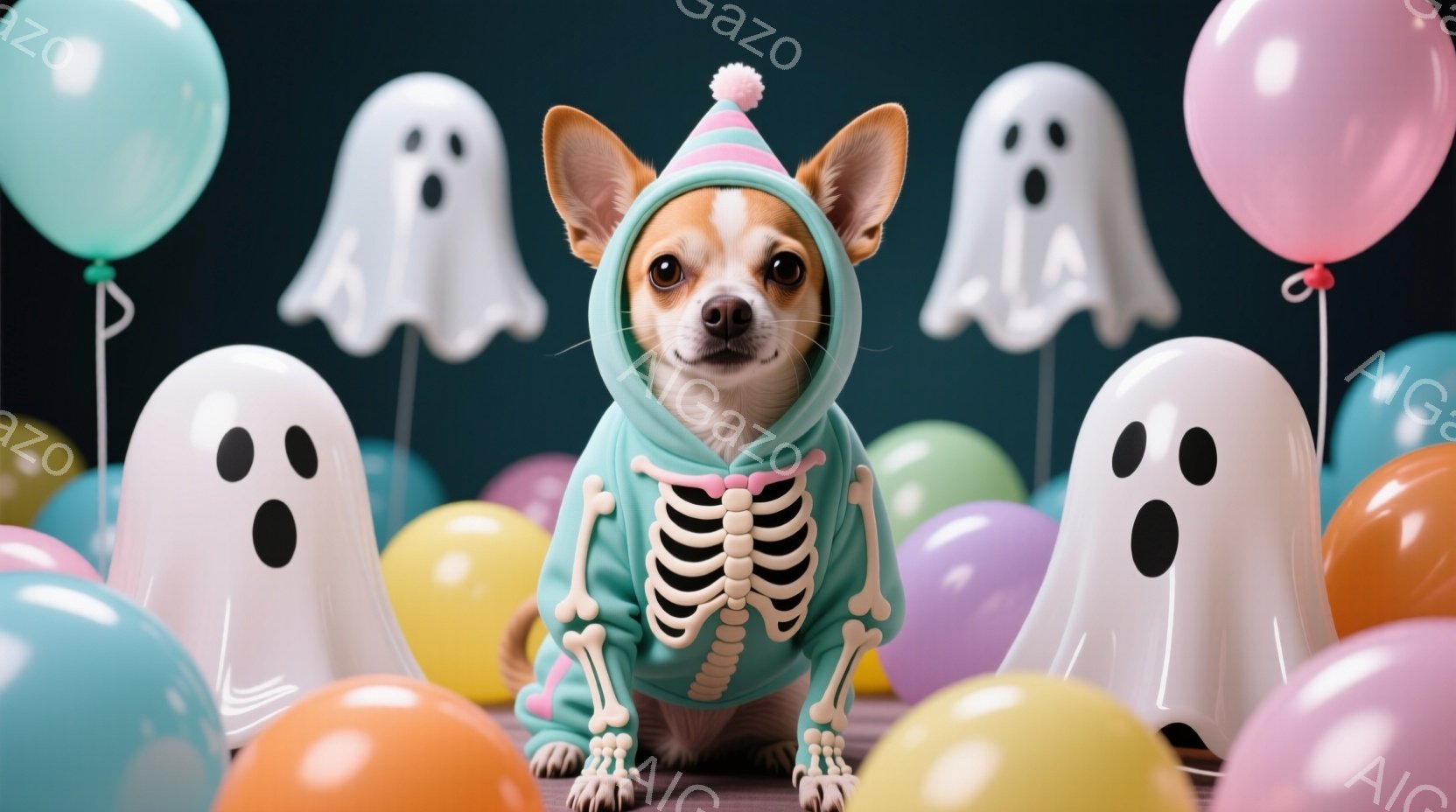 小さなチワワがハロウィーン風の衣装を着て正面を向いています。ピンク色のセーターに骸骨のプリントがあり、とても可愛らしい表情をしています。背景にはパステルカラーの風船や幽霊の飾りがあり、お祭り気分を盛り上げています。