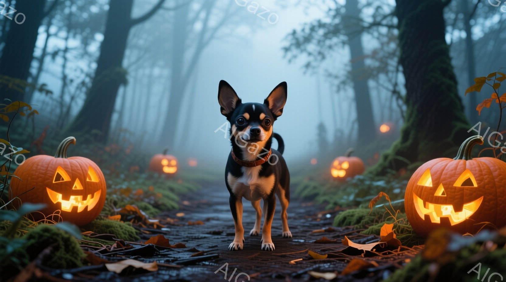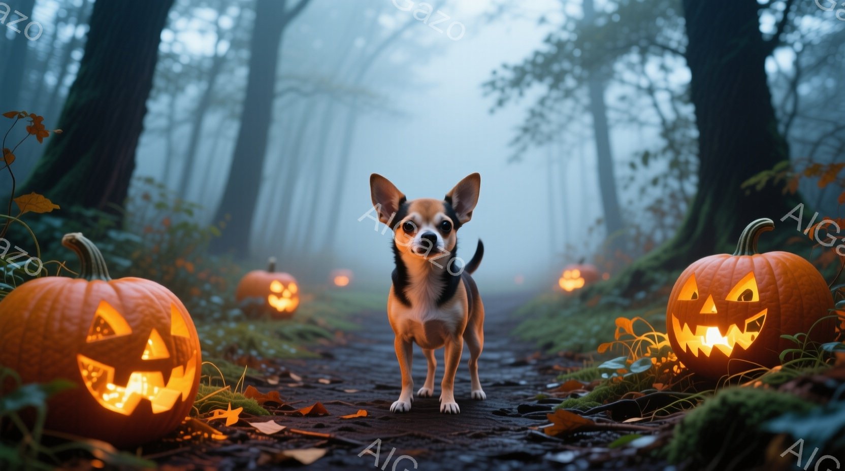 切り株や落ち葉が敷き詰められた森の小道に、小さなチワワが立っている。周囲にはジャック・オ・ランタンが置かれ、ぼんやりとした光を放ち、背景には霧が立ち込めて不気味な雰囲気を醸し出している。チワワはまっすぐ前を見ており、その表情は少し警戒しているように見える。