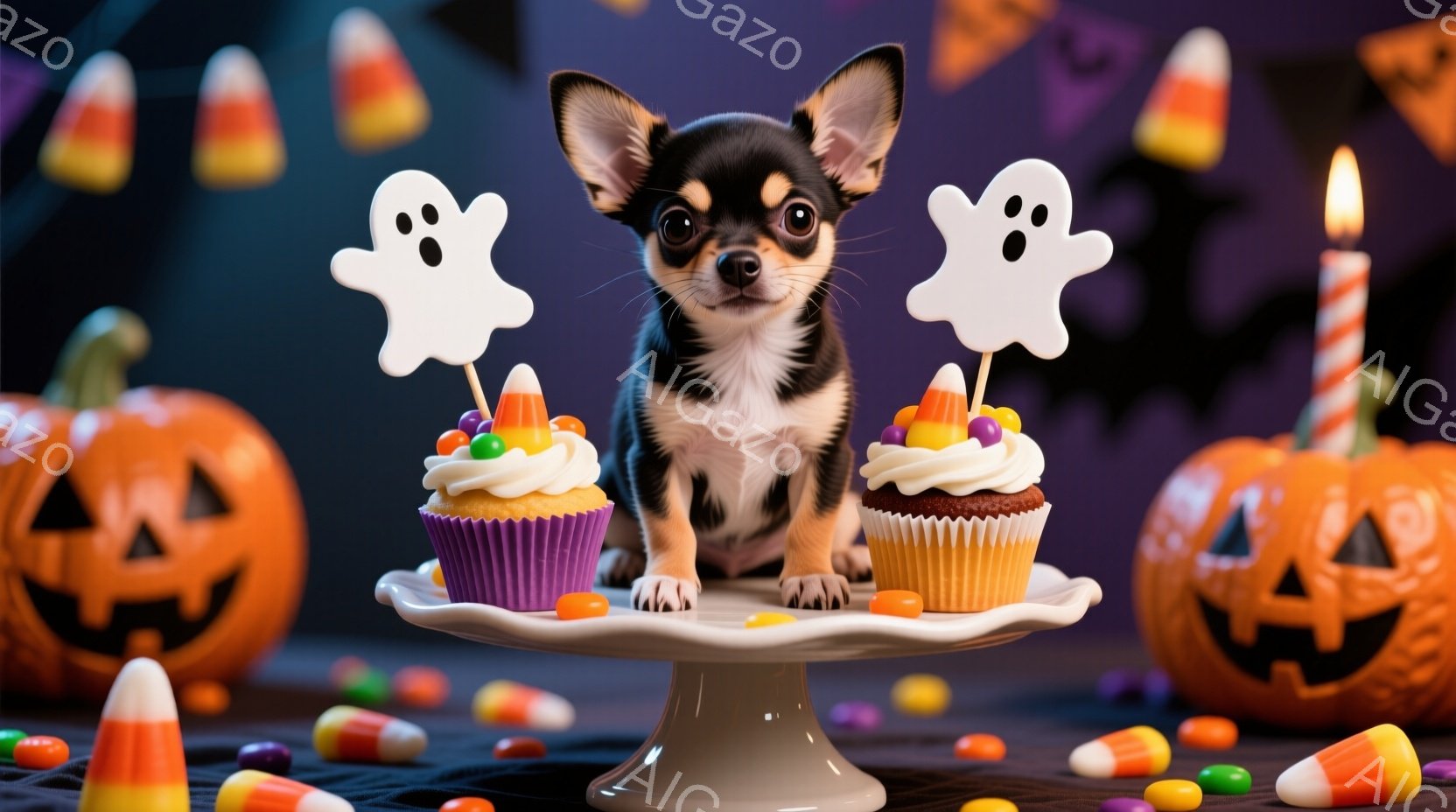 小さなチワワが、ハロウィーンをテーマにした巨大なカップケーキの上に座っています。カップケーキはオレンジと紫のストライプの包装紙で覆われ、キャンディーコーンやカラフルな丸いキャンディーで飾られています。背景には、ジャック・オー・ランタンが2つと、ハロウィーンの飾り付けが散りばめられており、全体的に明るく楽しい雰囲気が漂っています。