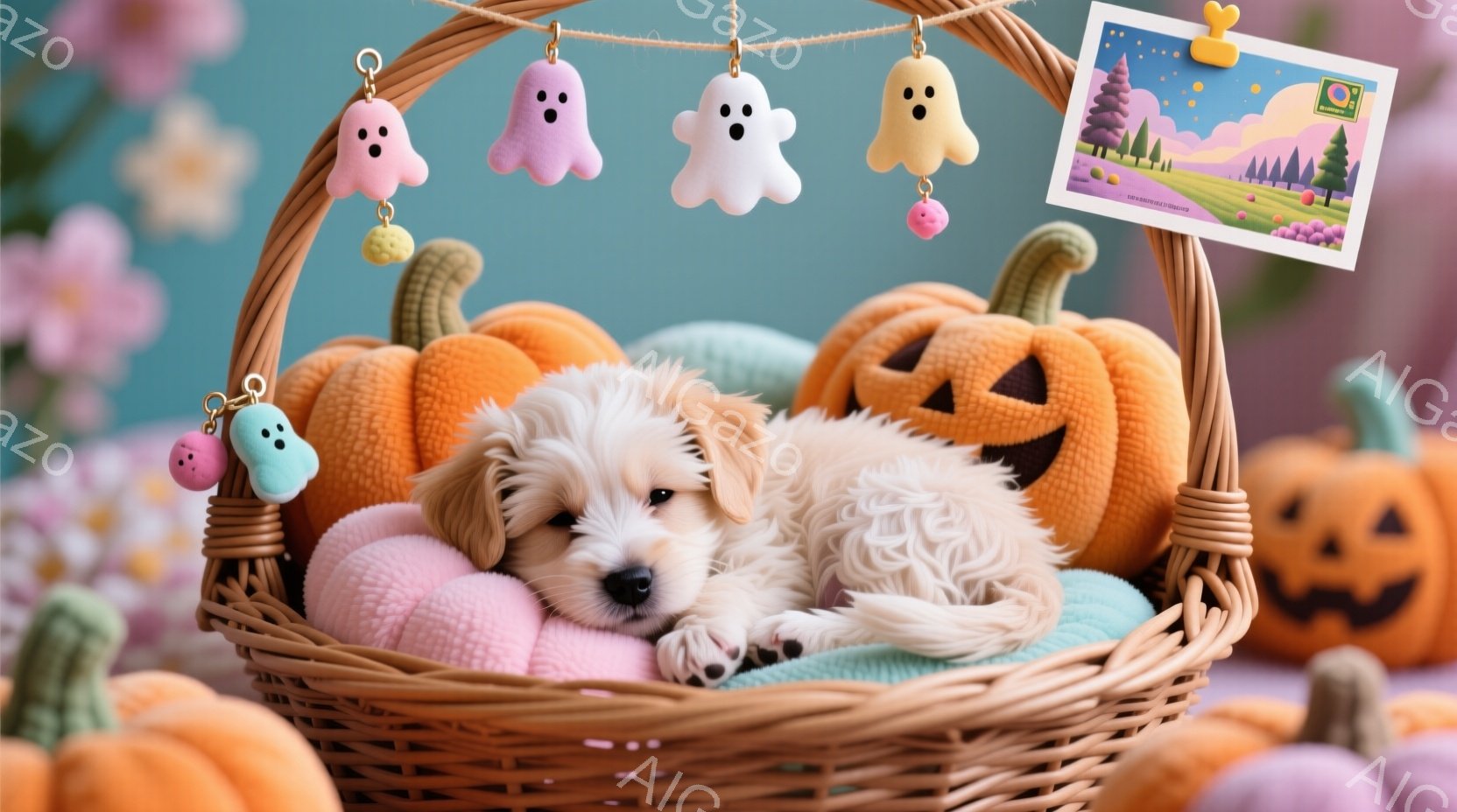 白い毛並みの小さな犬が、オレンジとピンクの柔らかいカボチャに囲まれた籐のバスケットの中で丸まって眠っています。頭上には、カボチャやお化けの形をした可愛らしいオーナメントが飾られており、背景は淡い水色で、全体的に暖かく優しい雰囲気です。ハロウィンを意識した装飾と愛らしい犬の姿が、見る人の心を和ませます。