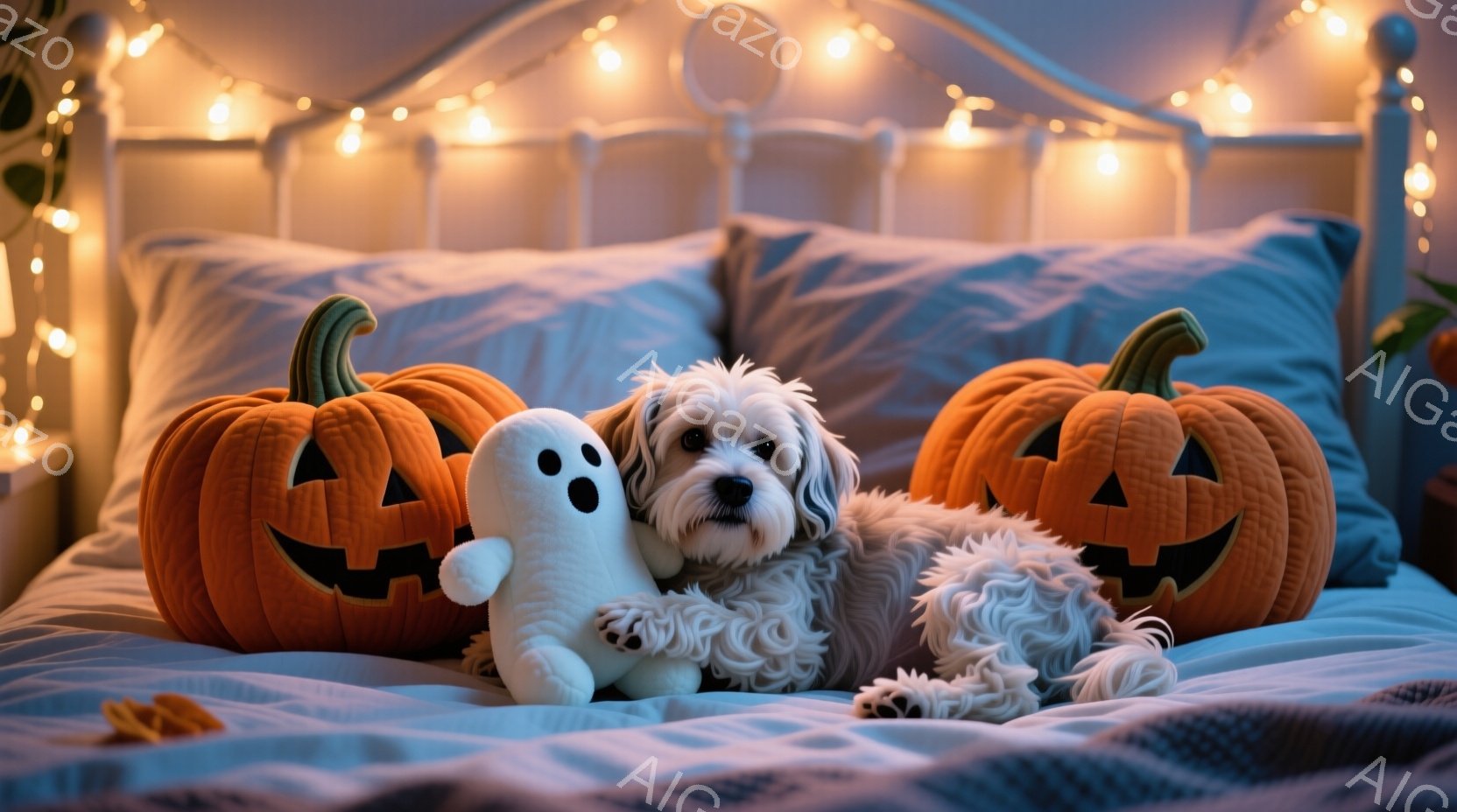 白い毛並みの犬がベッドに横たわり、ハロウィーンの象徴であるジャック・オ・ランタンのぬいぐるみとゴーストのぬいぐるみと寄り添っています。ベッドはクリーム色のシーツと枕で覆われ、背景には暖色の光が点在するハロウィーンライトが飾られています。全体的に、秋の温かく居心地の良い、お祝いの雰囲気が漂っています。