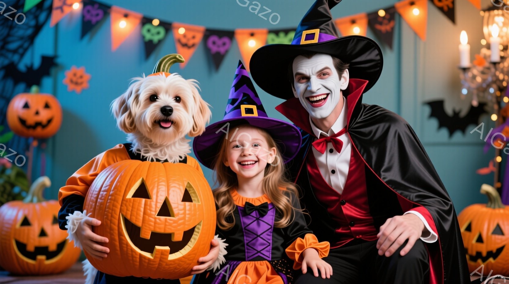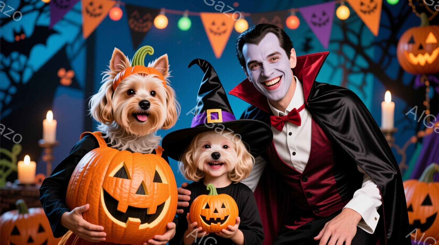 白い毛並みの小型犬2匹がそれぞれかぼちゃの衣装を着て、ハロウィーンの飾り付けられた背景の前でポーズをとっています。一人の男性はドラキュラの衣装を着て、犬たちと一緒にかぼちゃのランタンを持っています。背景にはオレンジと紫の風船、ハロウィーンの装飾が飾られ、お祝いの雰囲気が漂っています。