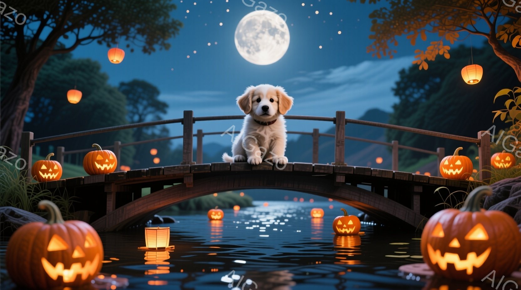 小さな子犬が、ハロウィーンの装飾が施された古い木製の橋の上に座っています。周りには、水の漂う光と、さまざまな大きさのジャック・オ・ランタンが置かれ、背景には暗い森と満月が広がっています。全体的に、幻想的で温かい雰囲気のハロウィーンの夜を描写しています。