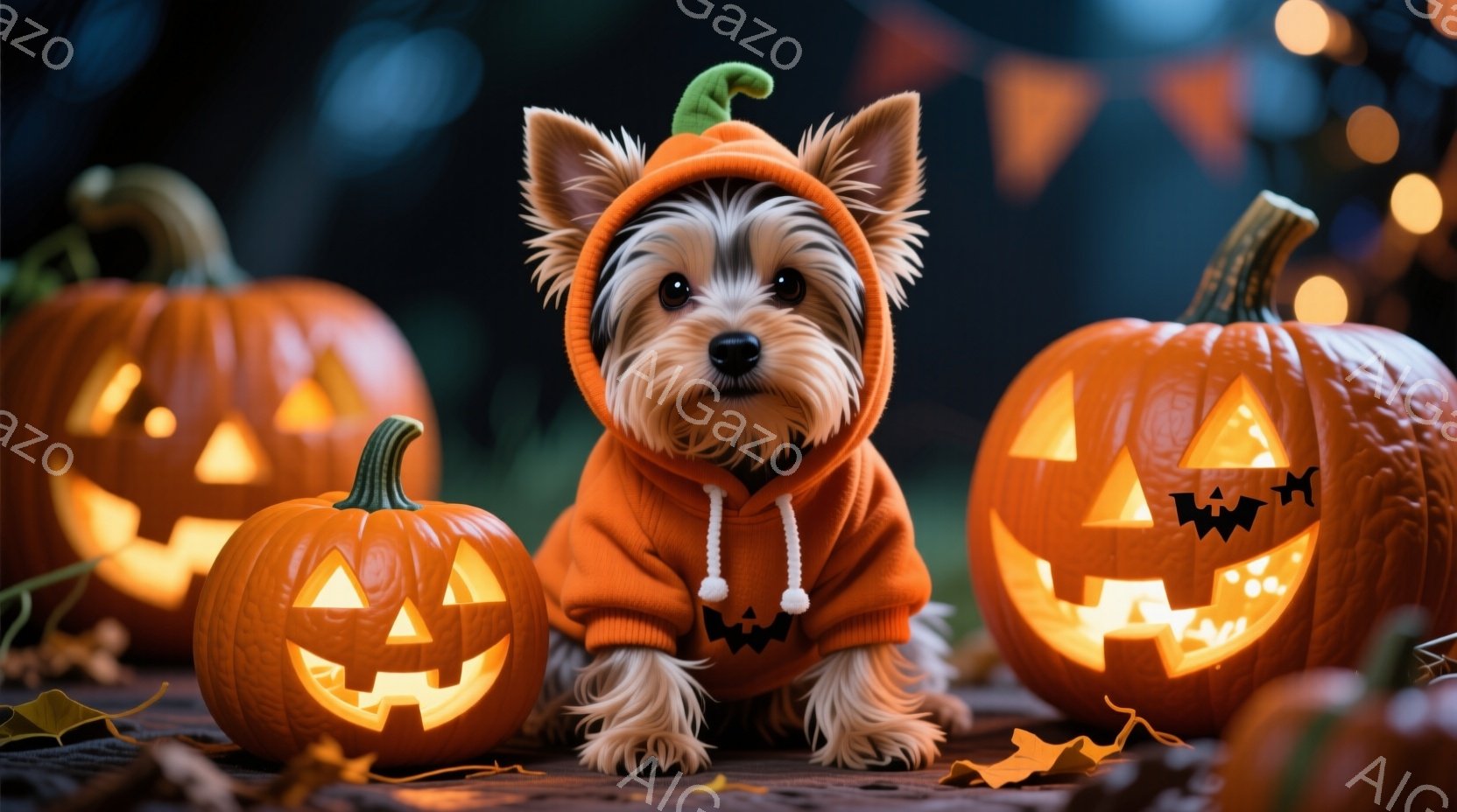 ヨークシャーテリアの子犬が、かぼちゃの形をしたオレンジ色のパーカーを着て、木製の床の上に座っています。周りには、くり抜かれて光るジャック・オー・ランタンが置かれ、背景にはぼんやりと夜空と他の光るカボチャが見えます。全体的に、ハロウィーンの雰囲気で、可愛らしく、温かい印象を与えます。