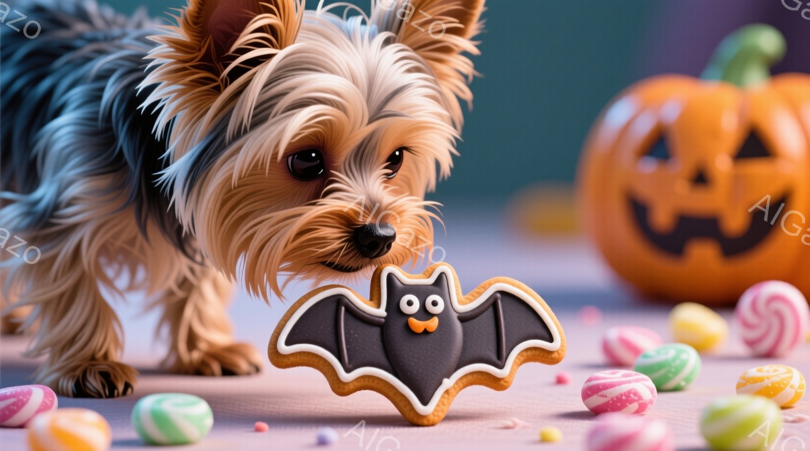 長毛のヨークシャーテリアが、バット型のクッキーに顔を近づけています。背景には、ハロウィーンを象徴するジャック・オ・ランタンやカラフルなキャンディーが散らばっており、紫色のテーブルクロスが敷かれています。全体的に、愛らしくてお祝いムード溢れるハロウィーンの雰囲気が表現されています。
