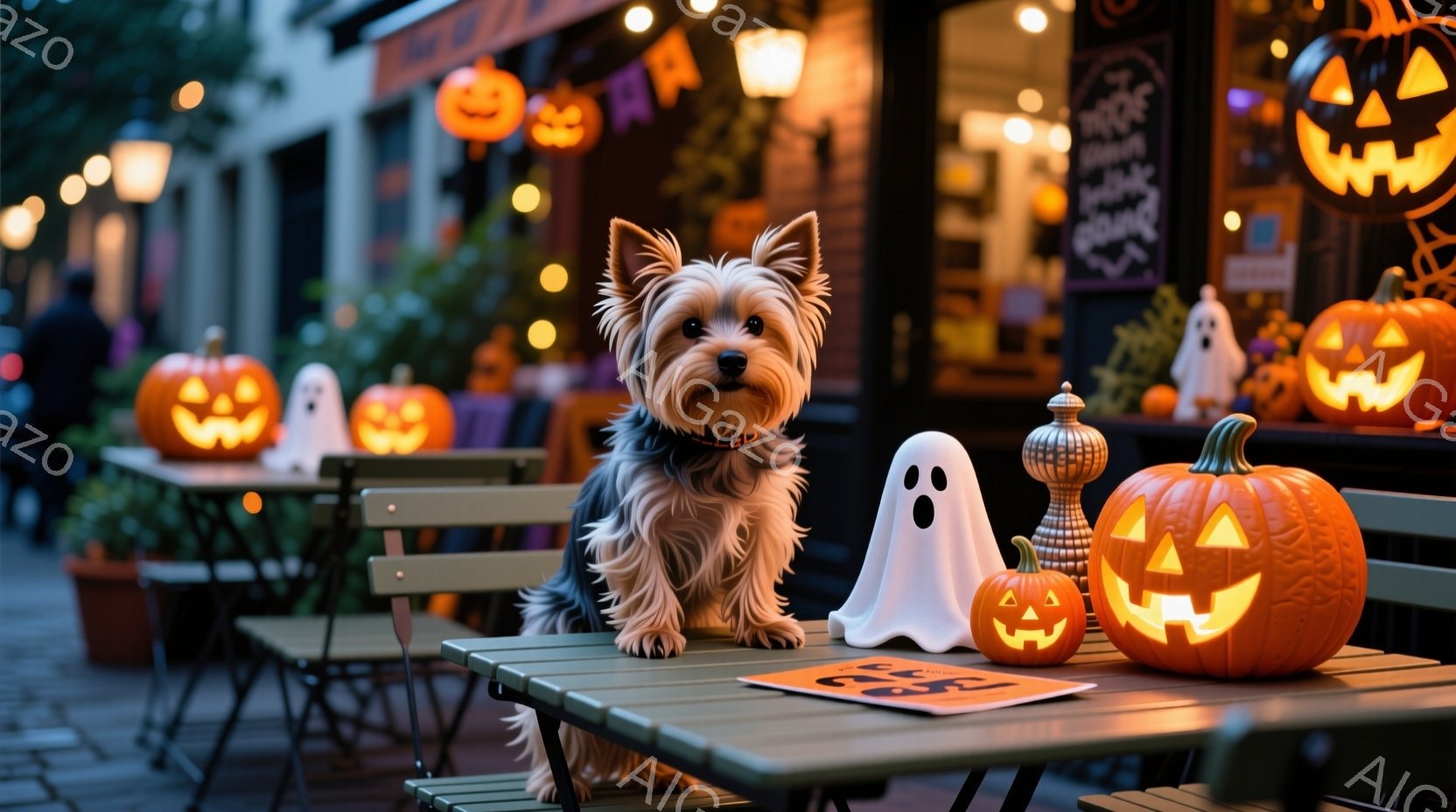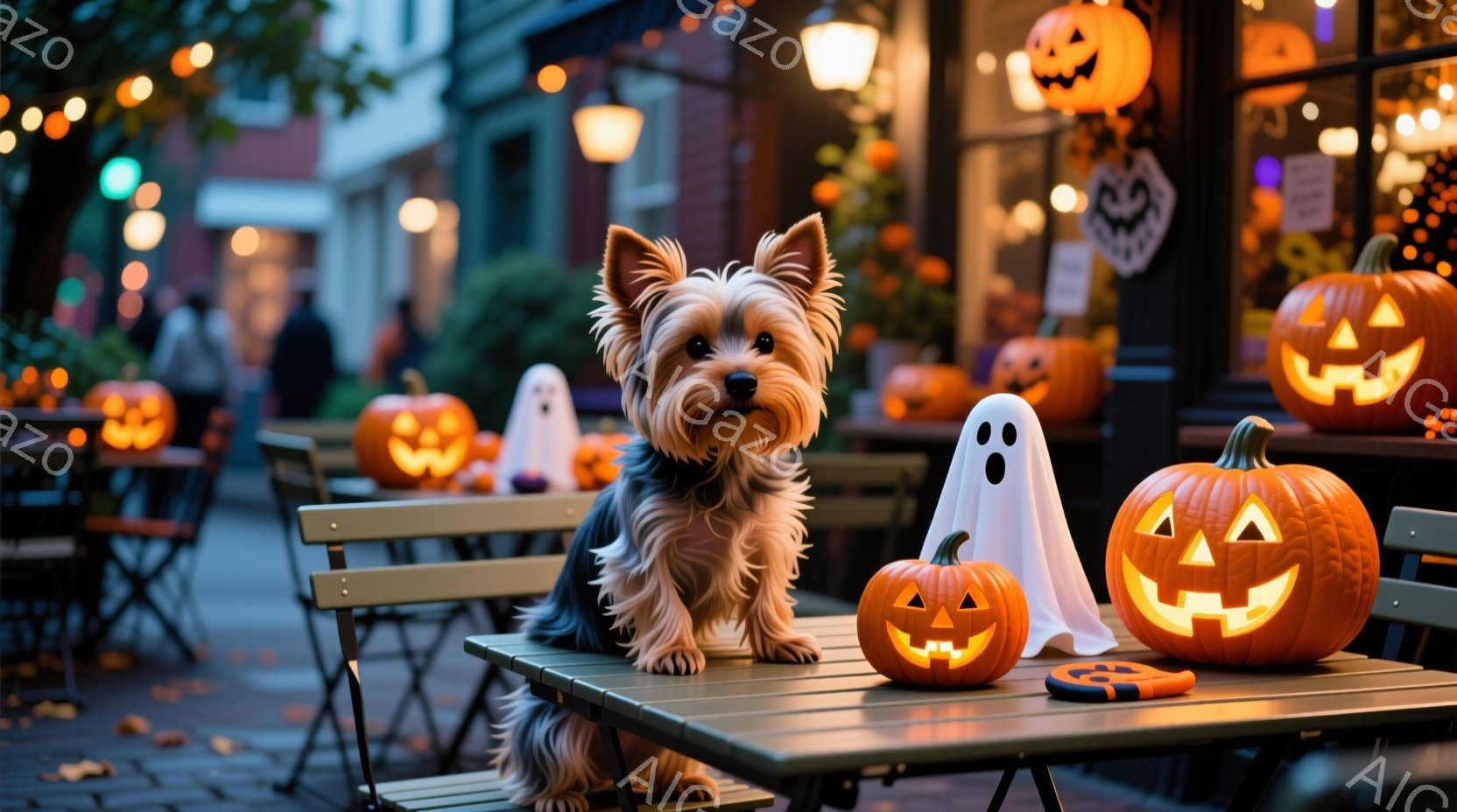 長い毛並みのヨークシャーテリアが、ハロウィーンの飾り付けがされた屋外カフェのテーブルに座っています。テーブルの上には、光るジャック・オー・ランタンと、白いお化けの置物が並び、背景にはさらに多くのハロウィーンの装飾が施された建物が見えます。全体的に、ハロウィーンの夜の温かく、お祝いムードに満ちた雰囲気です。