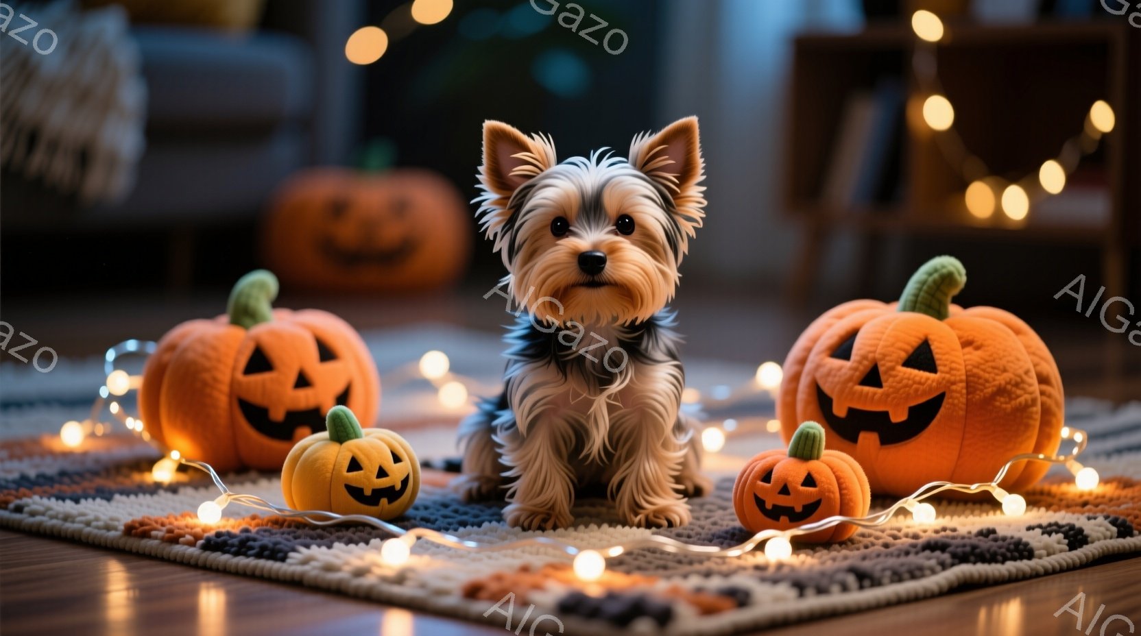 小さなヨークシャーテリアが、ハロウィーンの飾りである数個のジャック・オ・ランタンに囲まれて座っています。犬は首輪をつけており、真剣な表情で正面を見ています。背景には、ぼやけたリビングルームの一部が見え、温かい色のフェアリーライトが敷かれた丸いラグを囲んで配置されています。