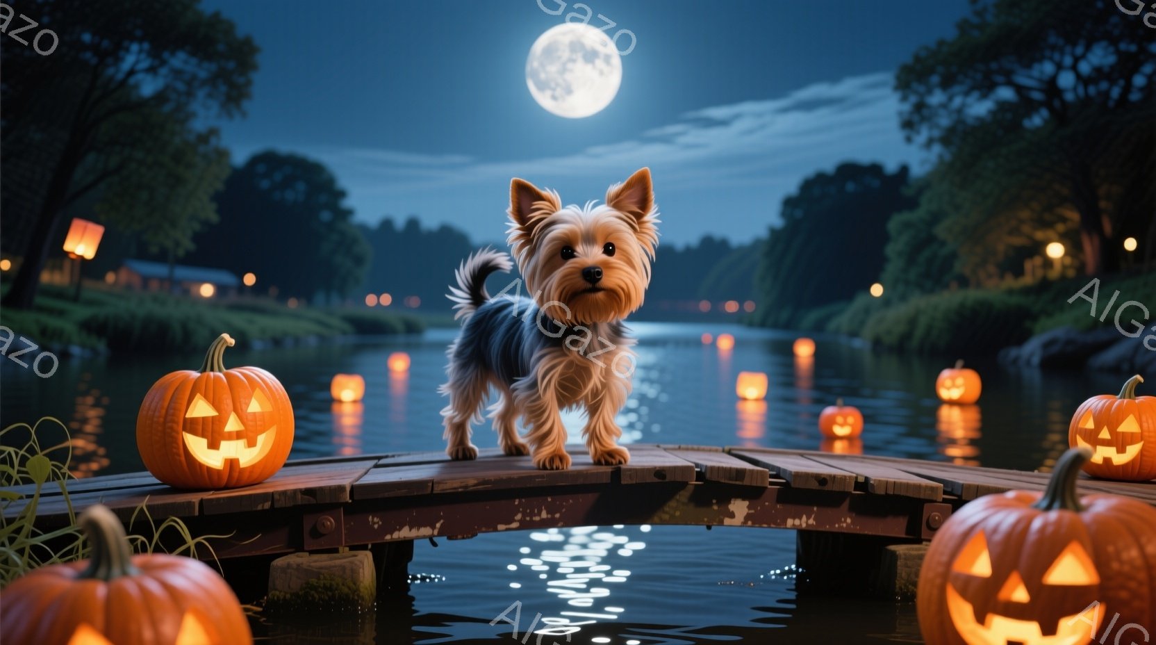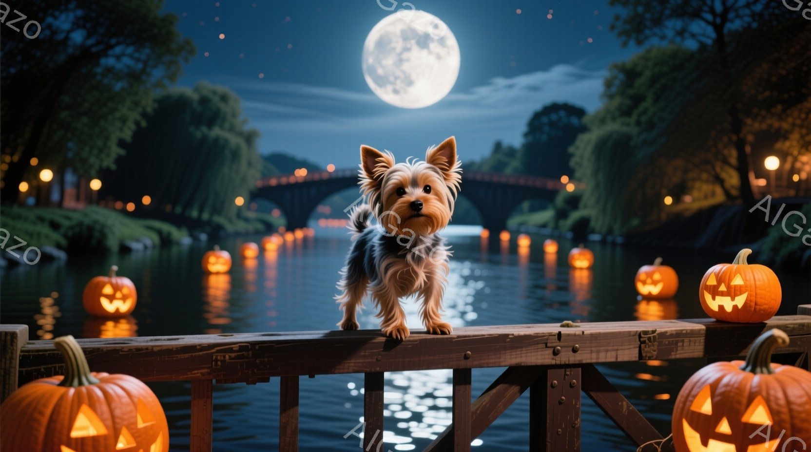 小さなヨークシャーテリアが、カボチャのランタンと提灯が並ぶ小さな橋の上で立っている。月明かりが水面に反射し、周囲の木々がシルエットになっている夜の風景だ。ハロウィーンの雰囲気で、どこか幻想的で温かい気分になる。