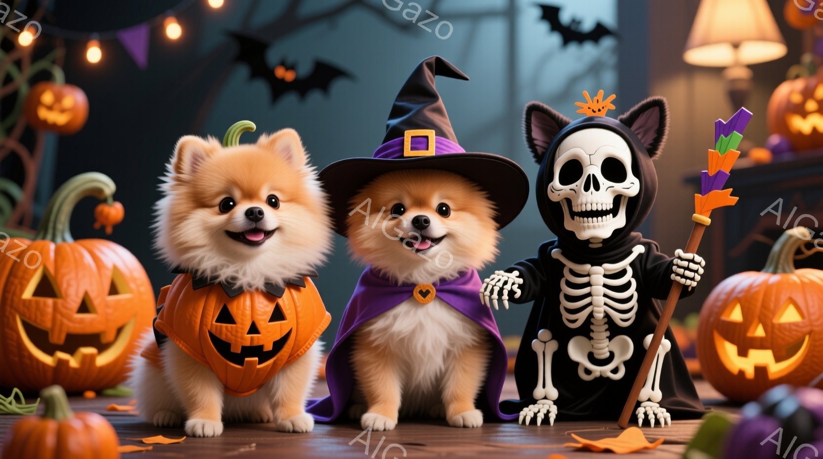 ふわふわのポメラニアンが、ハロウィーンの蝙蝠のコスチュームを着て、紫色の背景の前で立っている。背景には、カラフルなキャンディーやカボチャが飾られた店があり、全体的に明るくお祝いの雰囲気である。ポメラニアンは正面を見据え、可愛らしい表情をしている。