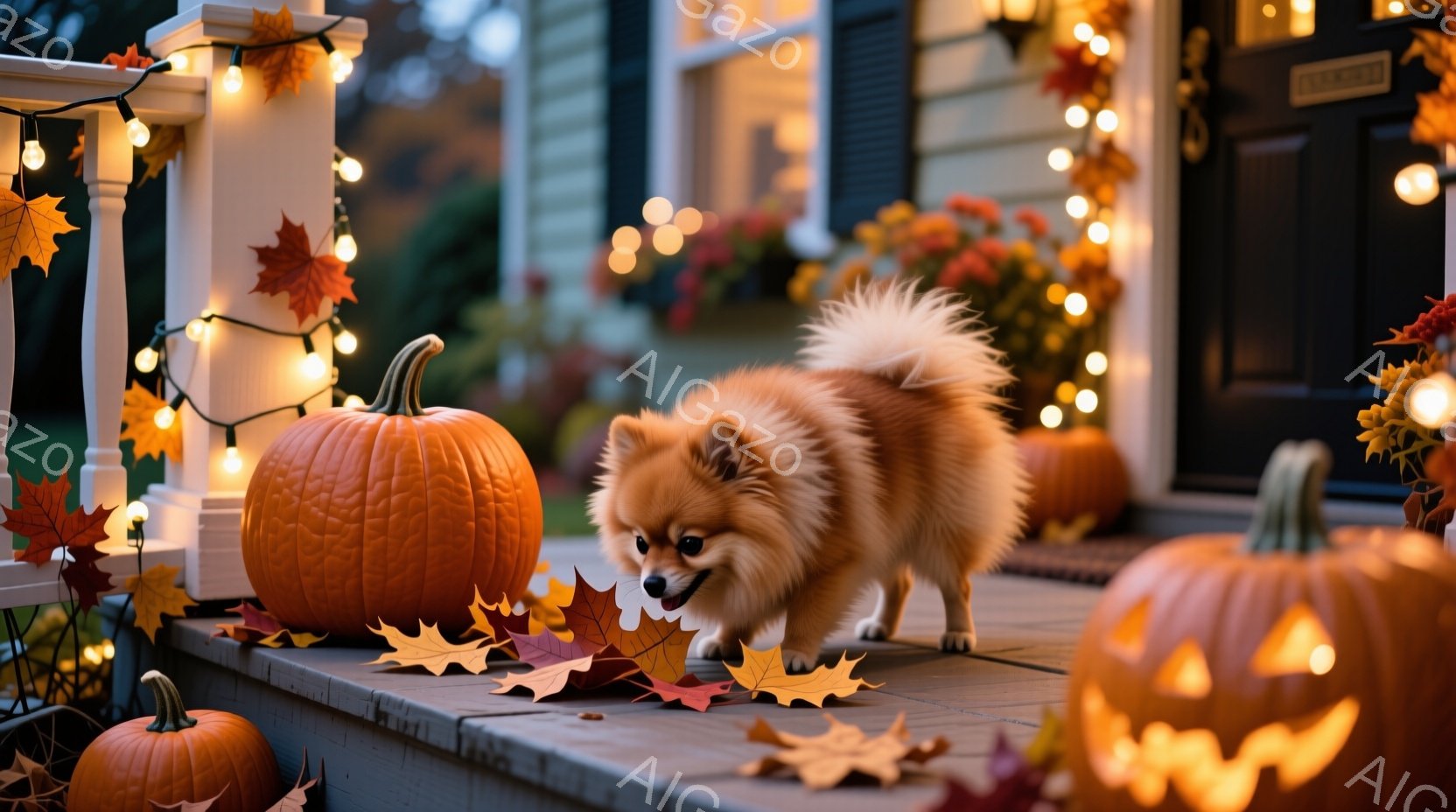 ポメラニアンが、ハロウィーンをテーマにしたケーキのプラッターに座っています。ケーキはピンクと水色のアイシングで装飾され、キャンディーコーンと幽霊の飾りがあります。背景には、カボチャのランタンと紫色のハロウィーンの旗が飾られ、お祝いの雰囲気を醸し出しています。