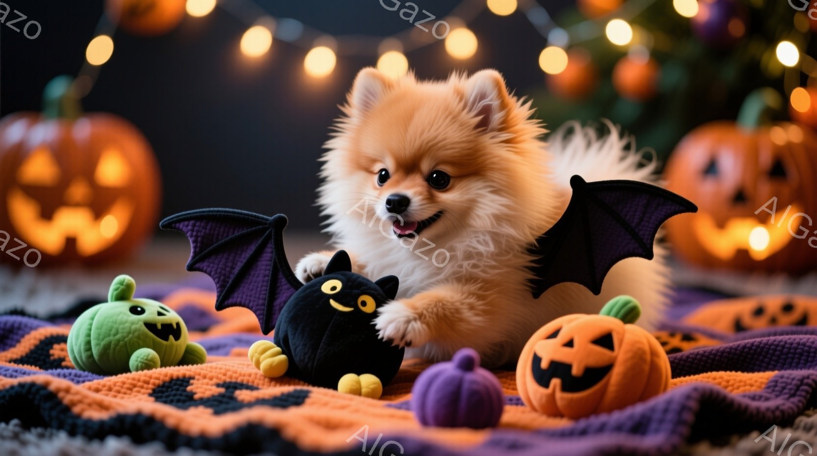 ふわふわのオレンジ色のポメラニアンの子犬が、黒いコウモリのおもちゃとオレンジ色のカボチャに囲まれて遊んでいます。子犬は口を開けて嬉しそうに微笑んでおり、両前足でコウモリのおもちゃをつかんでいます。背景には、オレンジと黒のストライプの布と、ぼんやりと光るハロウィーンライトがあり、全体的に明るく楽しい雰囲気が漂っています。