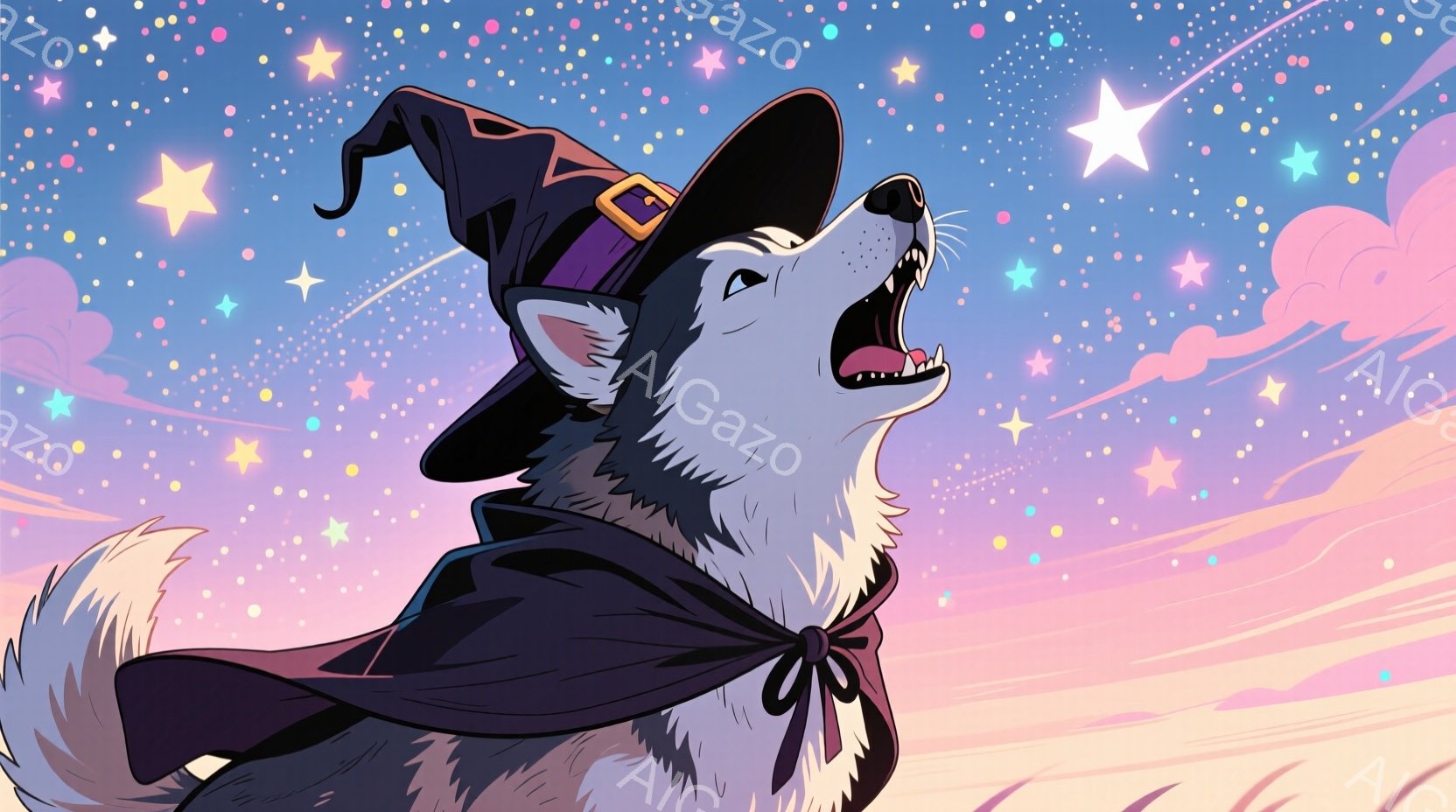 ハスキー犬が魔法使いの帽子とマントを身に着けて、夜空に向かって遠吠えしています。その表情は少しユーモラスで、夜空には無数の星と流れ星が輝き、夢幻的な雰囲気を醸し出しています。背景は淡いピンクと紫のグラデーションで、雲が浮かび、全体的に幻想的で優しい印象を与えます。