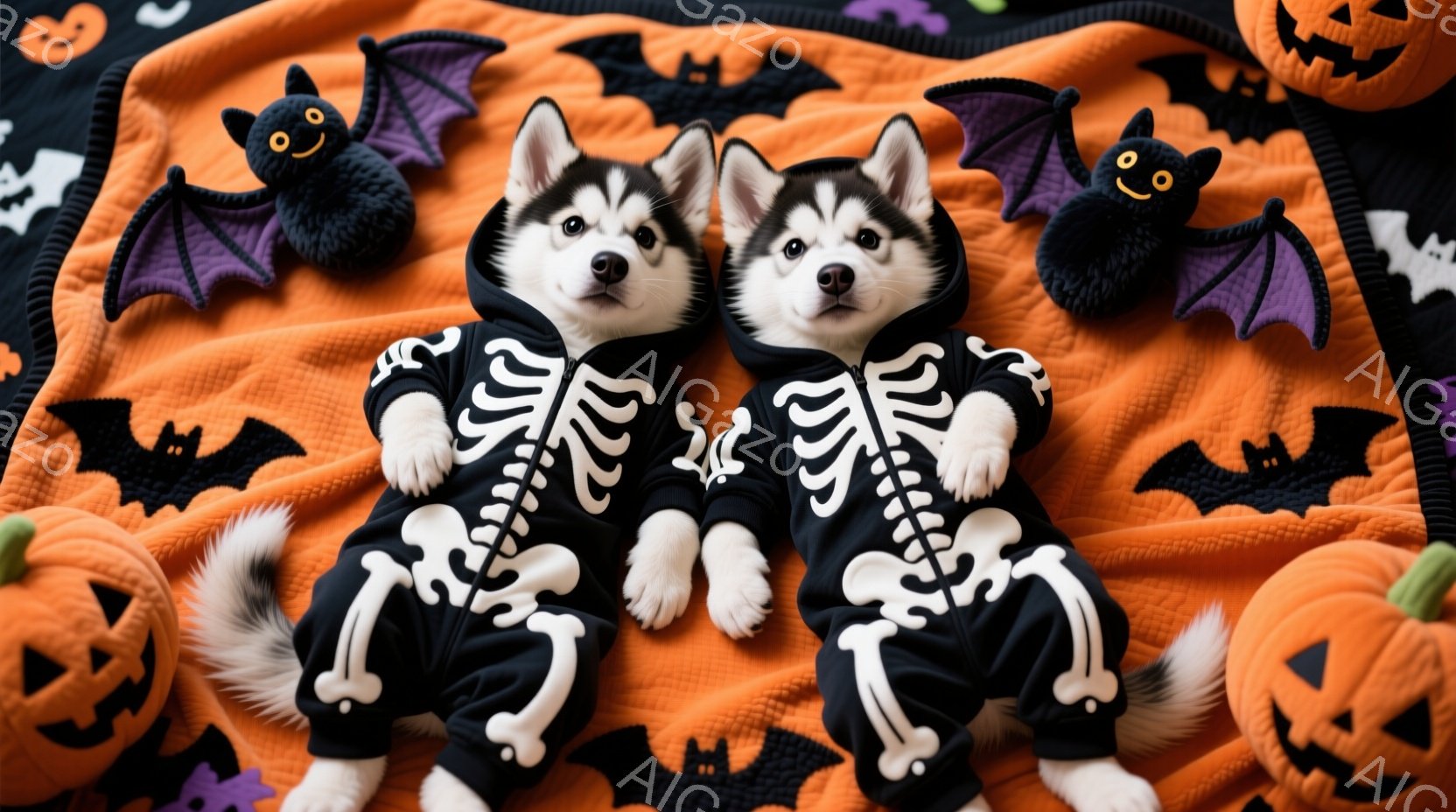 ハスキー犬が吸血鬼風の黒いマントを着て、レンガの道に座っています。背景には、ハロウィーンのランタンで飾られた不気味な家と、夜空を飛び交うコウモリ、そして落ち葉が散らばる庭が見えます。全体的に、ハロウィーンの夜の神秘的で楽しい雰囲気を醸し出しています。