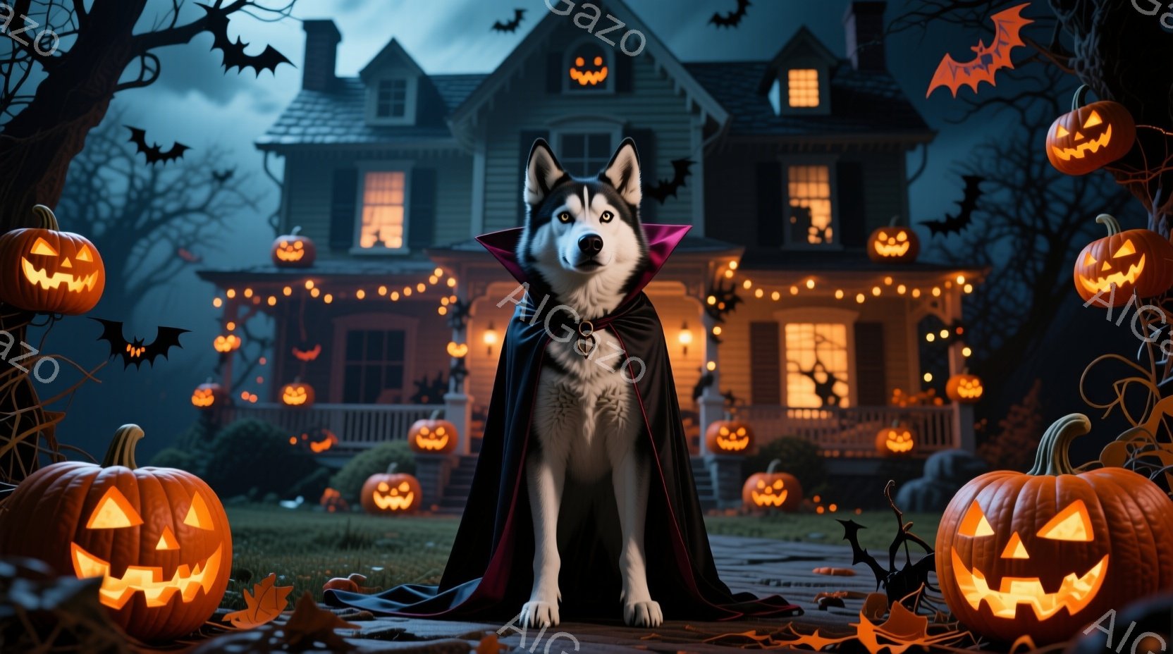 ハスキー犬が黒いマントを羽織り、ハロウィーンの夜に庭に座っています。背景には、カボチャのランタンで飾られた不気味な屋敷があり、夜空にはコウモリが飛び交っています。全体的に不気味でありながら可愛らしい、お祭り気分を醸し出すハロウィーンの雰囲気です。