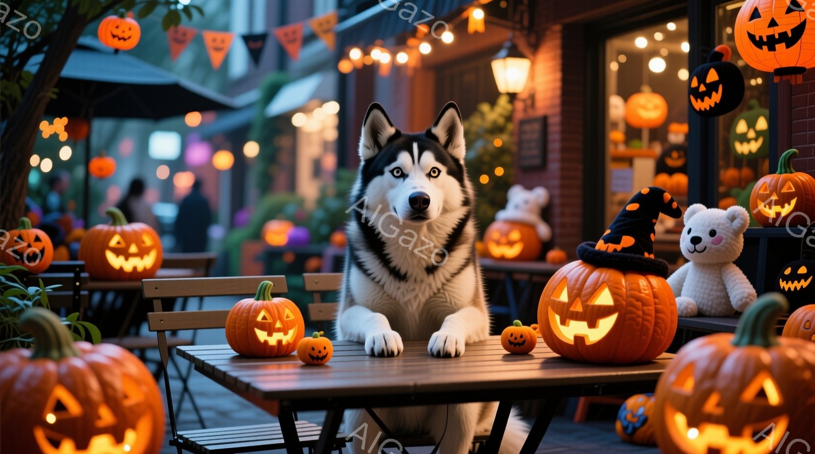 ハスキー犬が屋外のカフェのテーブルに座って正面を見つめています。テーブルの上や周囲には、様々な大きさのジャック・オー・ランタンやハロウィーンの飾り付けが置かれ、背景にはぼやけた街並みとハロウィーンの装飾が施された建物が見えます。 全体的に、ハロウィーンの夜の温かくお祝いムードを醸し出しています。