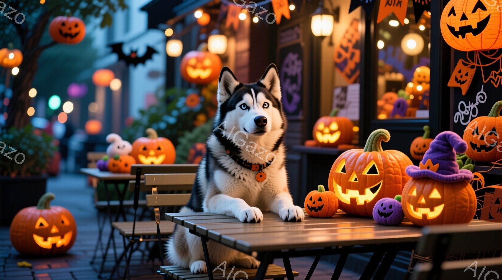 ハスキー犬が魔法使いの帽子と星が散りばめられた青いマントを身に着けて正面を見つめています。その周りには、ジャック・オー・ランタンが明るく光っており、夜の森のような背景が広がっています。全体的にハロウィンらしい、神秘的で楽しい雰囲気が漂っています。