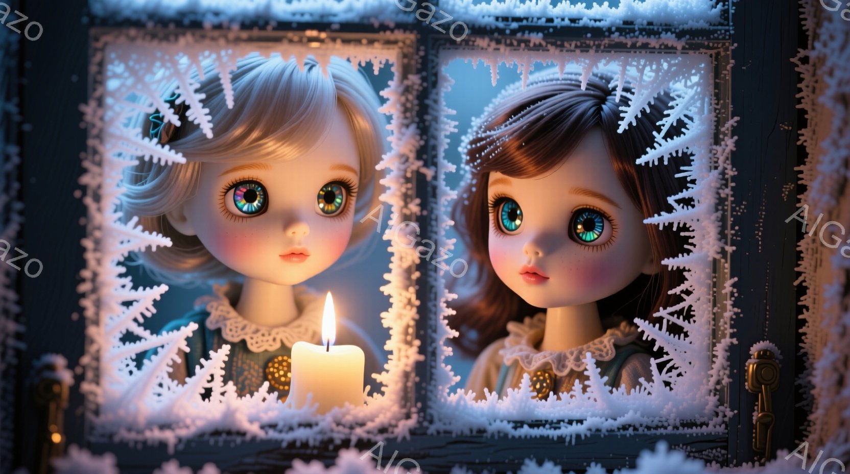 窓枠の中に置かれた人形が写っています。人形は茶色の巻き毛に、淡いピンク色のドレスを着ており、大きな青い目と微笑んだ表情をしています。背景は暗く、窓枠には雪の結晶模様が描かれており、窓の近くには火のついたロウソクが置かれ、冬の静かな夜の雰囲気を作り出しています。