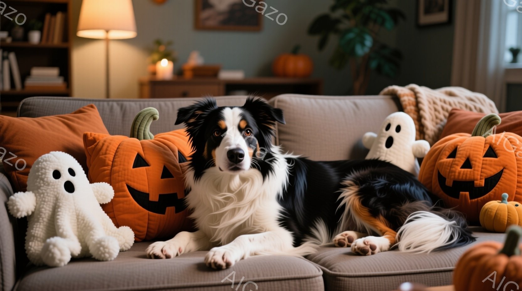 ハロウィーンをテーマにした可愛らしいシーンです。白いお化けと黒い猫が木製のテーブルの上に座っており、周囲にはジャック・オー・ランタンが置かれています。全体的に暖かく、お祝いムードで、ハロウィーンの楽しい雰囲気が伝わってきます。