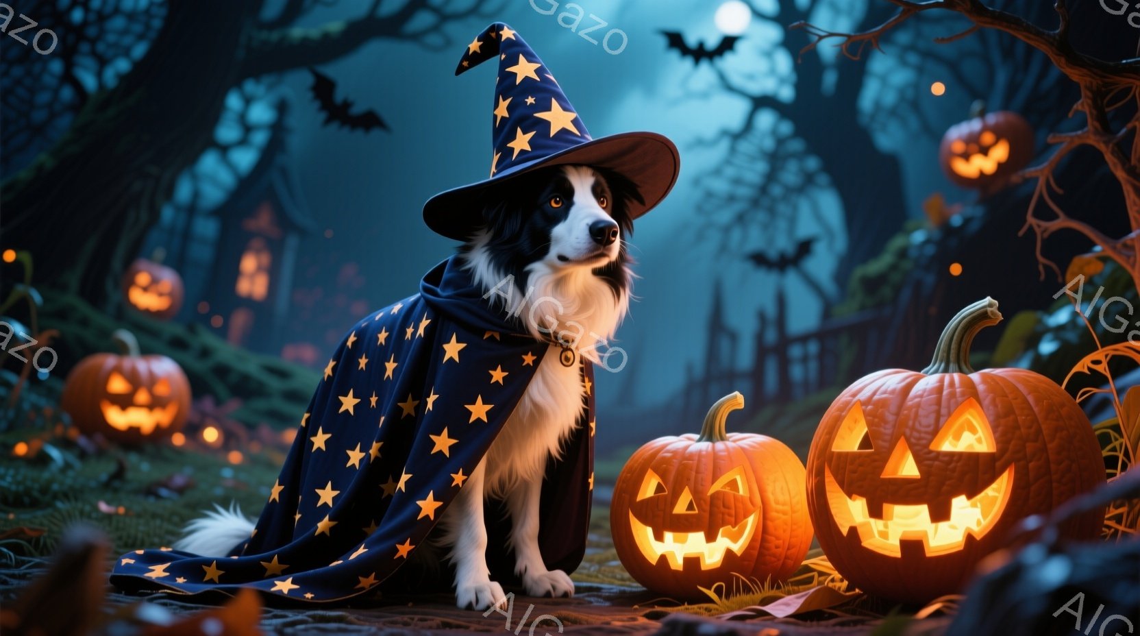 黒と白のボーダーコリーが、星柄のローブと先のとがった帽子を身につけ、まるで魔法使いのように座っている。周囲にはジャック・オー・ランタンが置かれ、背景には薄暗いお城とねじれた木々が見え、ハロウィーンの夜らしい不気味な雰囲気が漂っている。全体的に、幻想的で遊び心のある、お祝いのハロウィーンのシーンが描かれている。