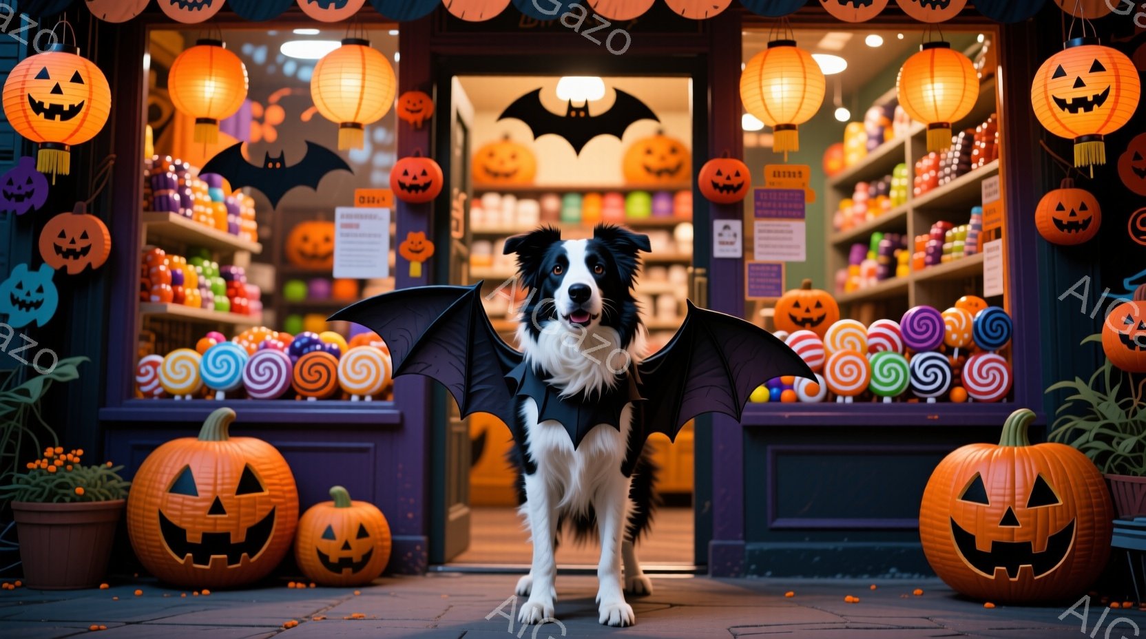 ハロウィーンの装飾が施された店の前に、翼をつけた犬が立っている。犬は黒と白の毛並みで、自信に満ちた表情をしている。背景には、カボチャのランタンやキャンディー、そして紫と黒の装飾が施された店があり、お祭りの雰囲気を醸し出している。