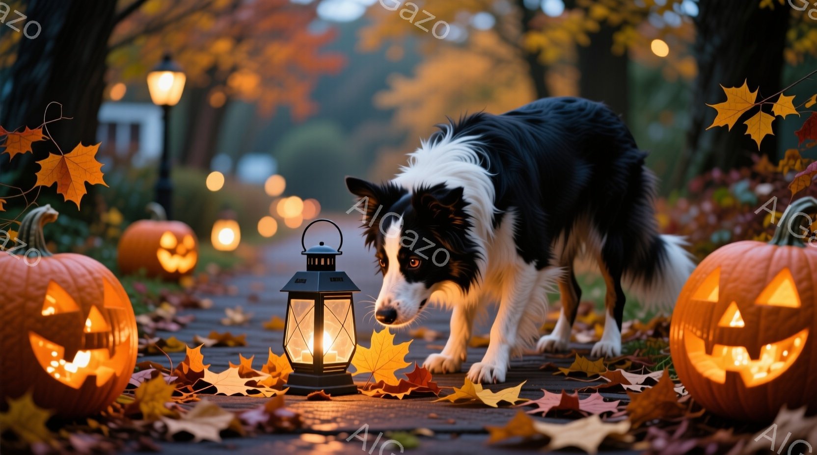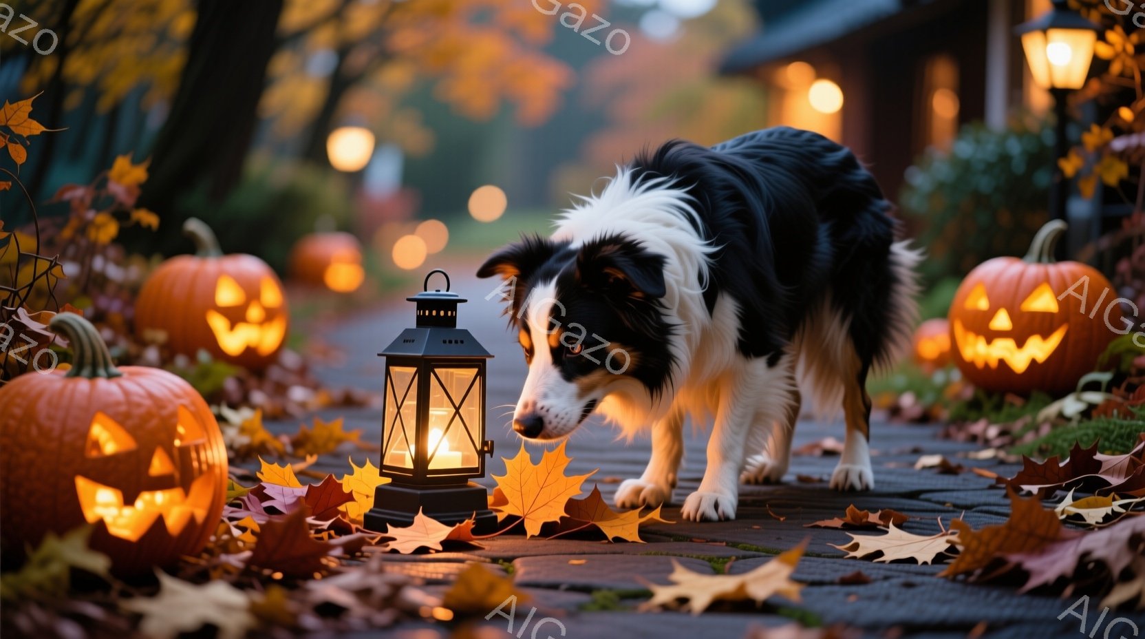 ハロウィーンの雰囲気漂う道に、ボーダーコリーが佇んでいます。道端には、ジャック・オー・ランタンが灯り、落ち葉が散らばり、秋の暖かさと祝祭感を演出しています。犬は少し上目遣いで、どこかを見つめており、その表情は好奇心と穏やかさが混ざり合っています。