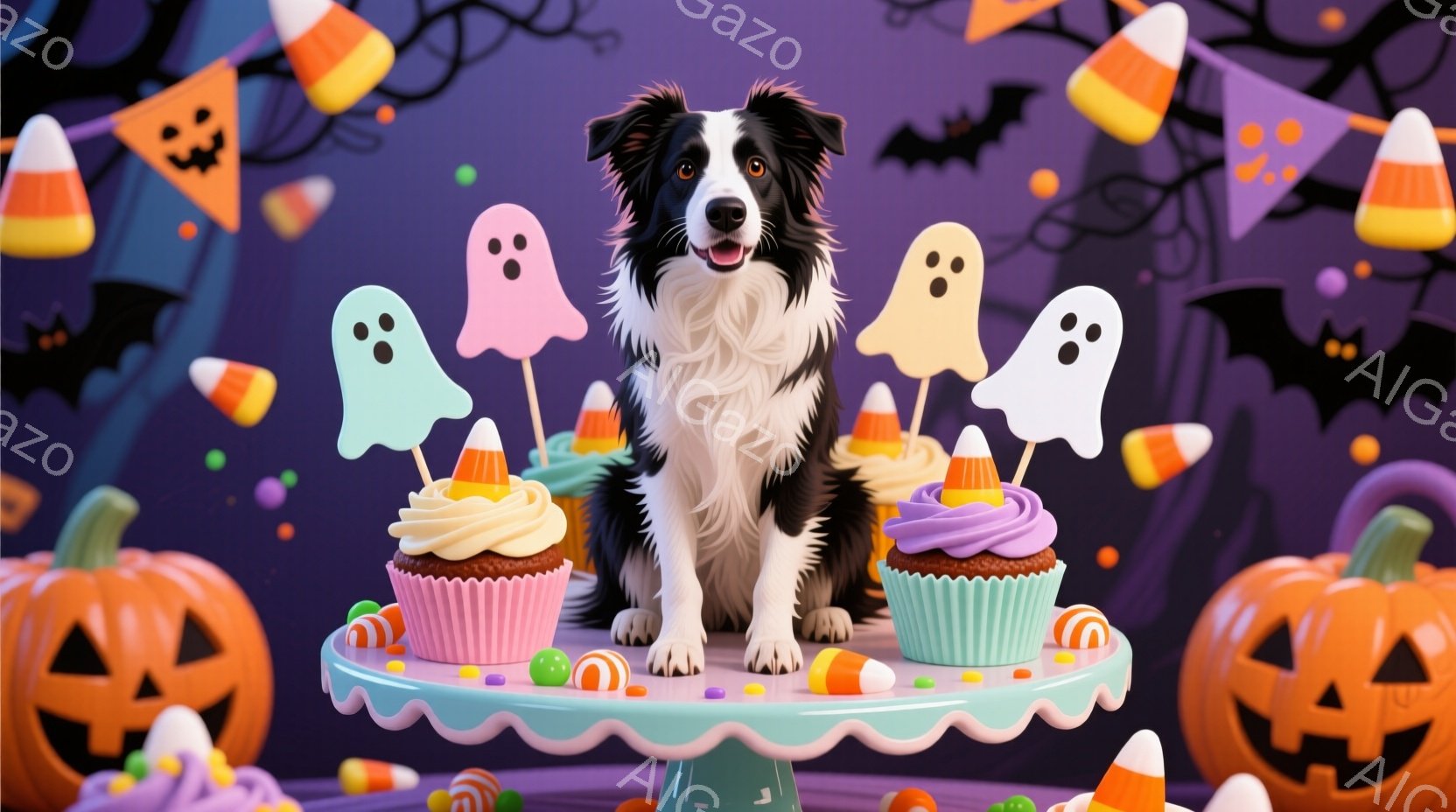 切り株で作られた道に、彫刻されたハロウィンのカボチャが並び、その間に石油ランタンが置かれている。毛並みの美しいボーダーコリーが、地面に散らばる紅葉を踏みしめながら、興味深そうにランタンを匂っている。背景にはオレンジ色や黄色の紅葉が茂り、暖かい光が秋の静寂を際立たせている。