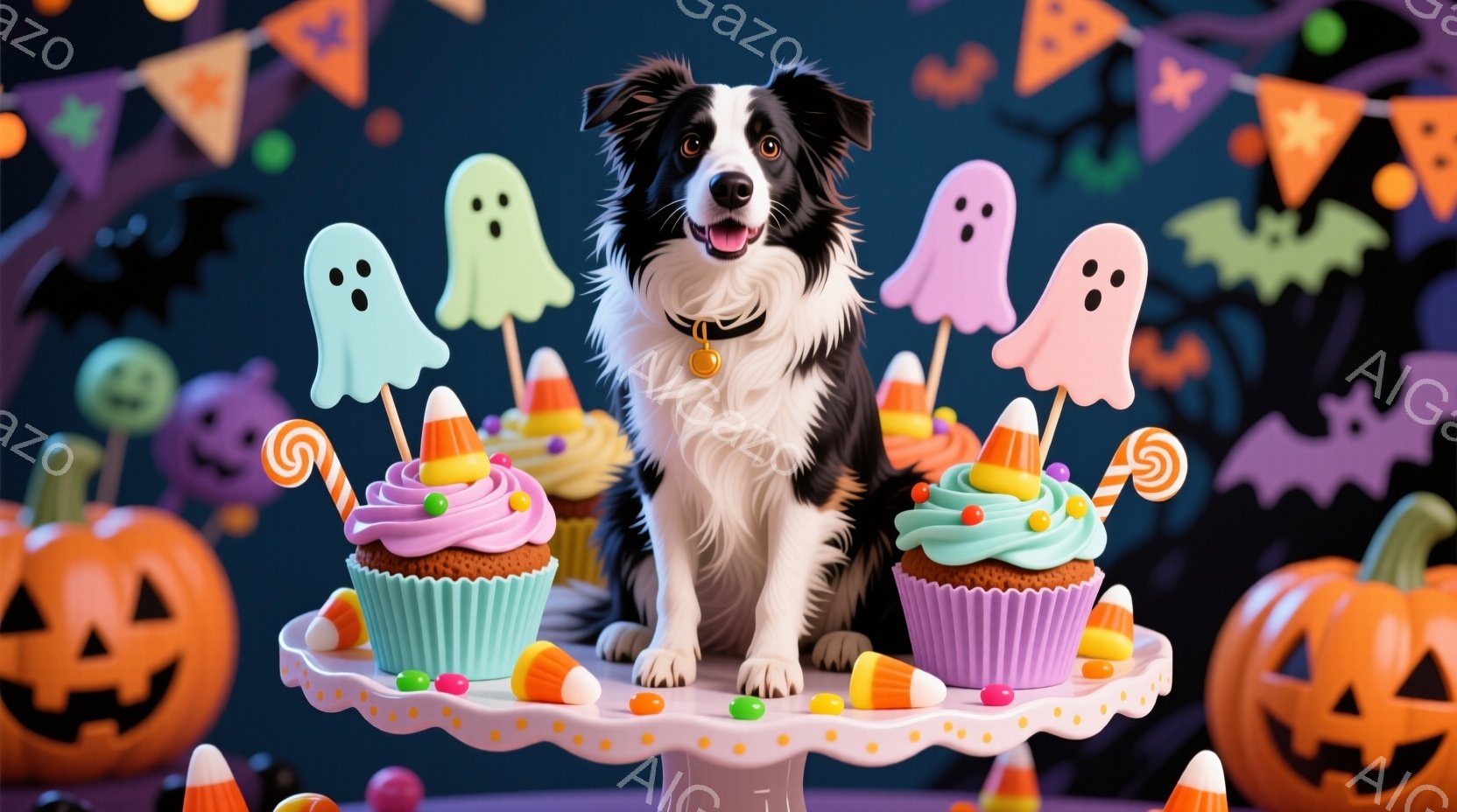 黒と白のボーダーコリーが、ハロウィーンをテーマにしたケーキスタンドの上に座っています。ケーキはピンクと水色のクリームで飾られ、キャンディコーンと幽霊の形をした飾りが付いています。背景には、オレンジ色のジャック・オ・ランタンと、カラフルなキャンディ、そして紫色の背景に黒いコウモリが描かれており、お祝いの雰囲気が漂っています。