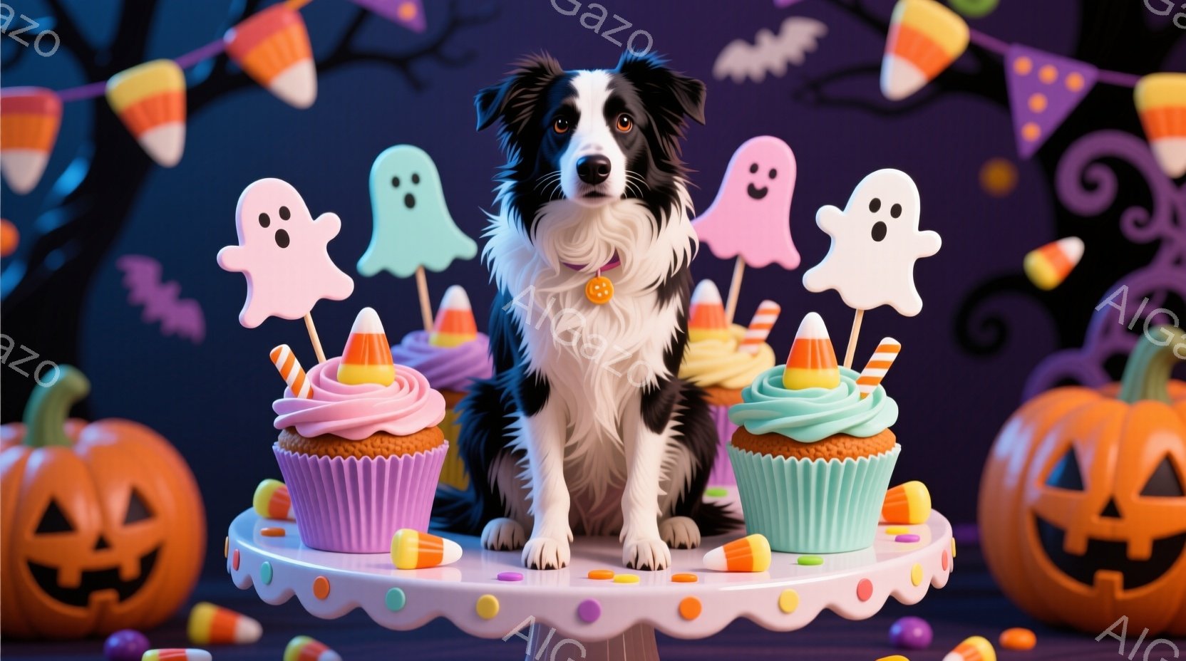 黒と白のボーダーコリーが、ハロウィーンをテーマにしたケーキスタンドの上に座っています。ケーキは紫やピンクのアイシングで飾られ、キャンディコーンや幽霊の形をした飾り付けが施されています。背景には、ジャックオーランタンとオレンジと紫色の旗が飾られた、お祝いムードのハロウィーンの背景が広がっています。