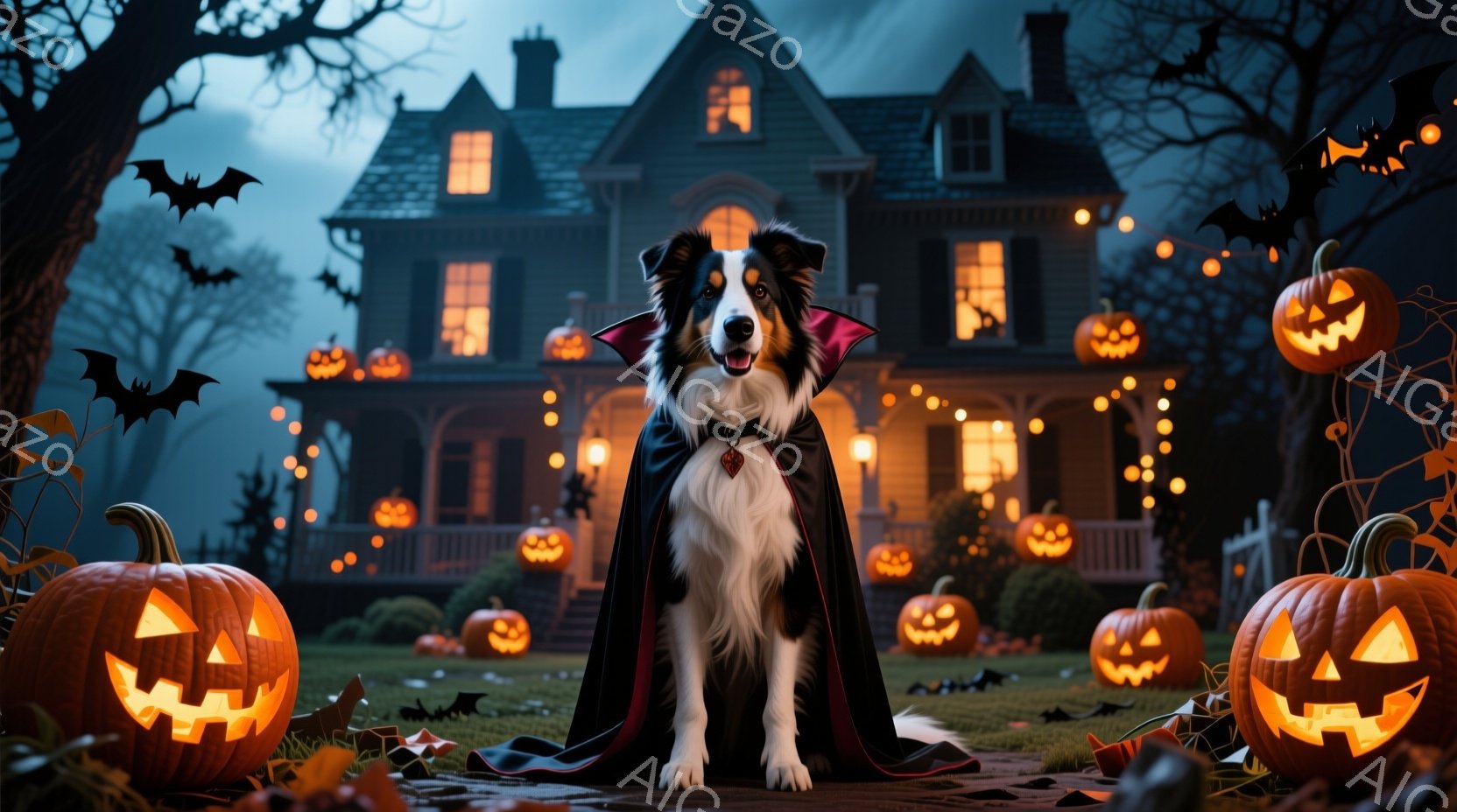 ハロウィーンをテーマにした画像で、ボーダーコリーが黒いマントを羽織って正面を向いています。背景には、たくさんのジャック・オ・ランタンで飾られた古い屋敷と、暗い空を飛ぶコウモリが描かれ、ハロウィーンの不気味な雰囲気を醸し出しています。庭にはカボチャが置かれ、不気味ながらも温かい光が全体を包んでいます。