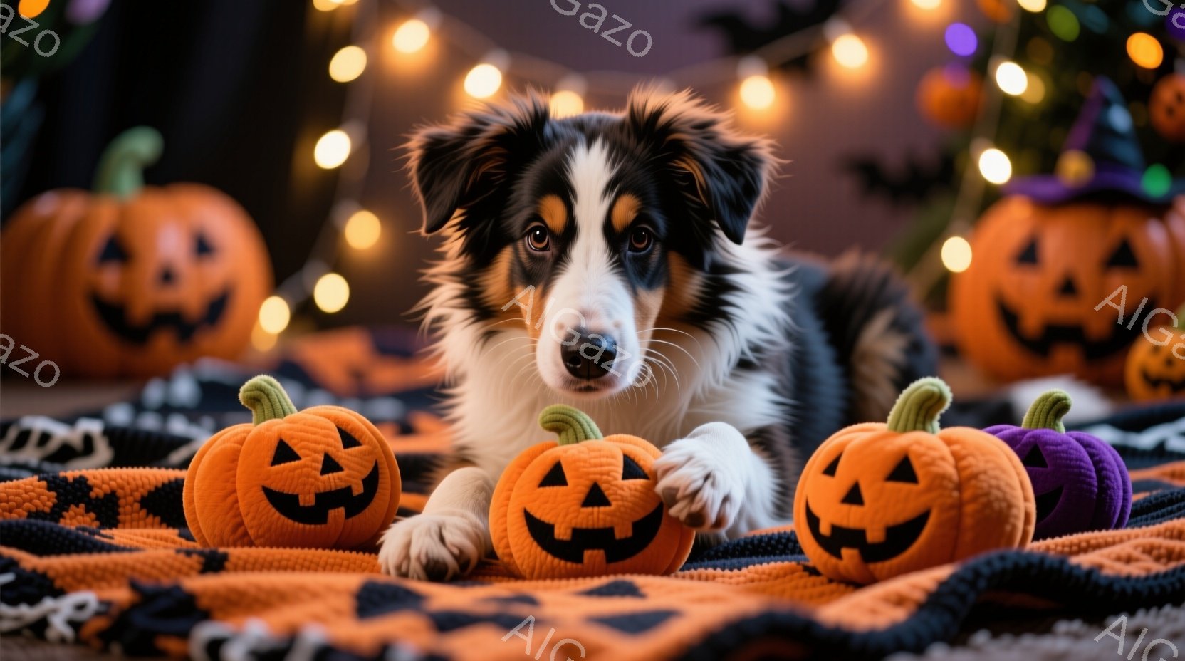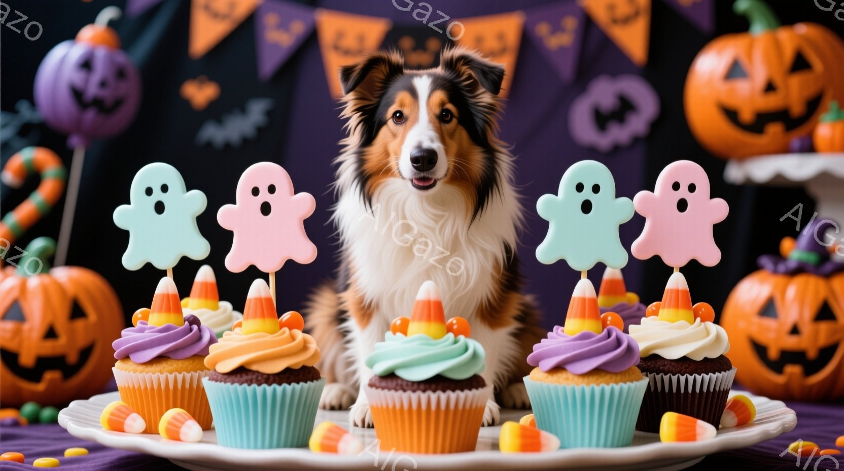 鮮やかなハロウィーンの背景を背景に、美しいボーダーコリーがカップケーキの前で座っています。カップケーキはピンク、オレンジ、紫色のアイシングで飾られ、それぞれにハロウィーンのお菓子がトッピングされています。背景には、かぼちゃのランタンや、お菓子、お化けの飾りなどが散りばめられ、お祝いの雰囲気が漂っています。