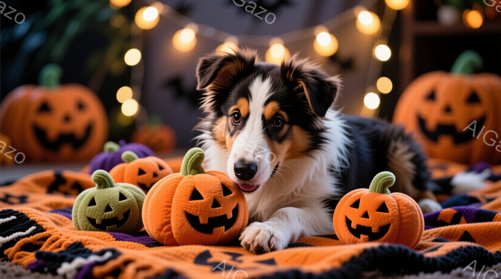 この無料AI生成画像「茶色と白の毛並みを持つコリー犬が、ハロウィーンのガイコツのコスチュームを着ています。犬は正面を向き、少し微笑んでいるように見え、コスチュームの骨格模様が鮮やかに映えています。背景には、パステルカラーの風船と幽霊の形をした風船があり、お祭り気分を盛り上げています。」は、2025年10月24日に作成されました。 サイズは 1664×928px の高解像度で、商用利用も可能なフリー素材として提供しています。