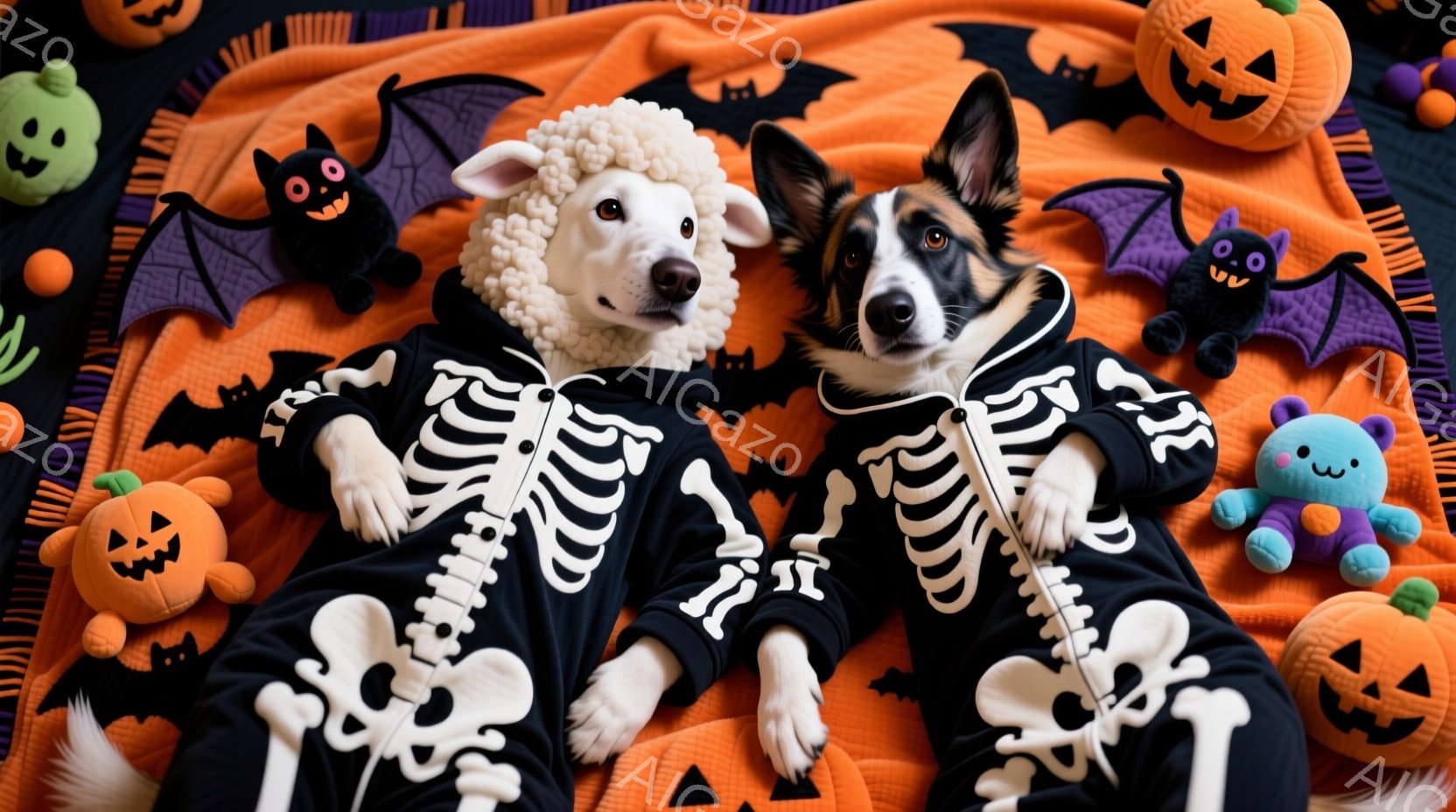 オレンジ色の背景に、骸骨のコスチュームを着た二匹の犬が横たわっています。犬たちは白いふわふわの襟をつけ、少し驚いたような表情でこちらを見ています。背景にはハロウィーンの装飾品であるカボチャやコウモリ、おもちゃの羊などが散りばめられ、季節感あふれる可愛らしい雰囲気です。